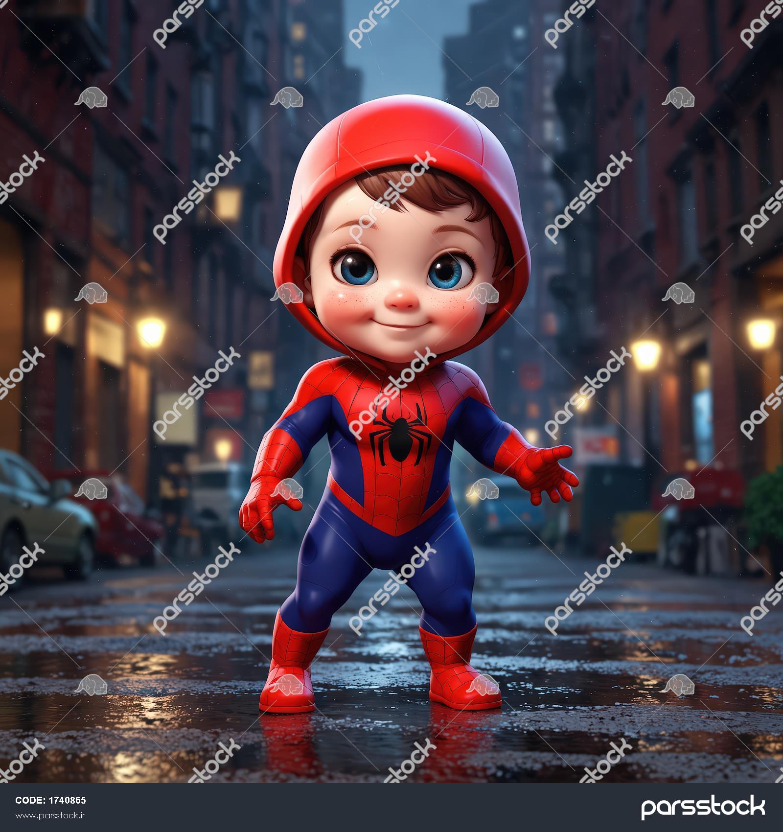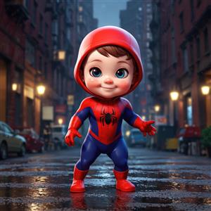 تصویر نوزاد پسر اسپایدرمن با کلاه در خیابان بارانی شهر، طرح سه‌بعدی فانتزی با رفلکس نور در آب