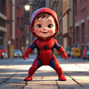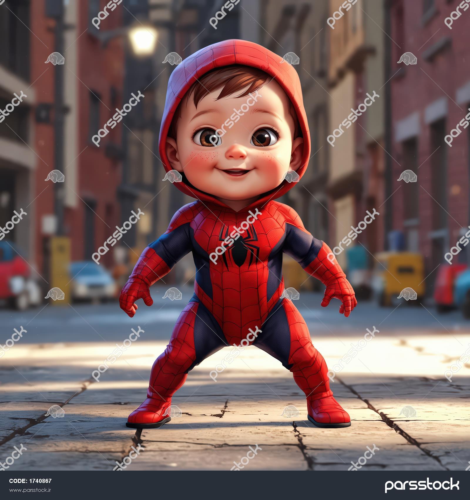 عکس اورجینال نوزاد پسر اسپایدرمن با کلاه قرمز در خیابان، طرح فانتزی سه‌بعدی شهری، مناسب چاپ دکوراتیو
