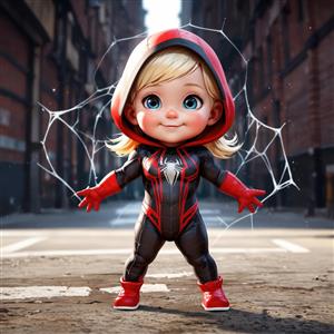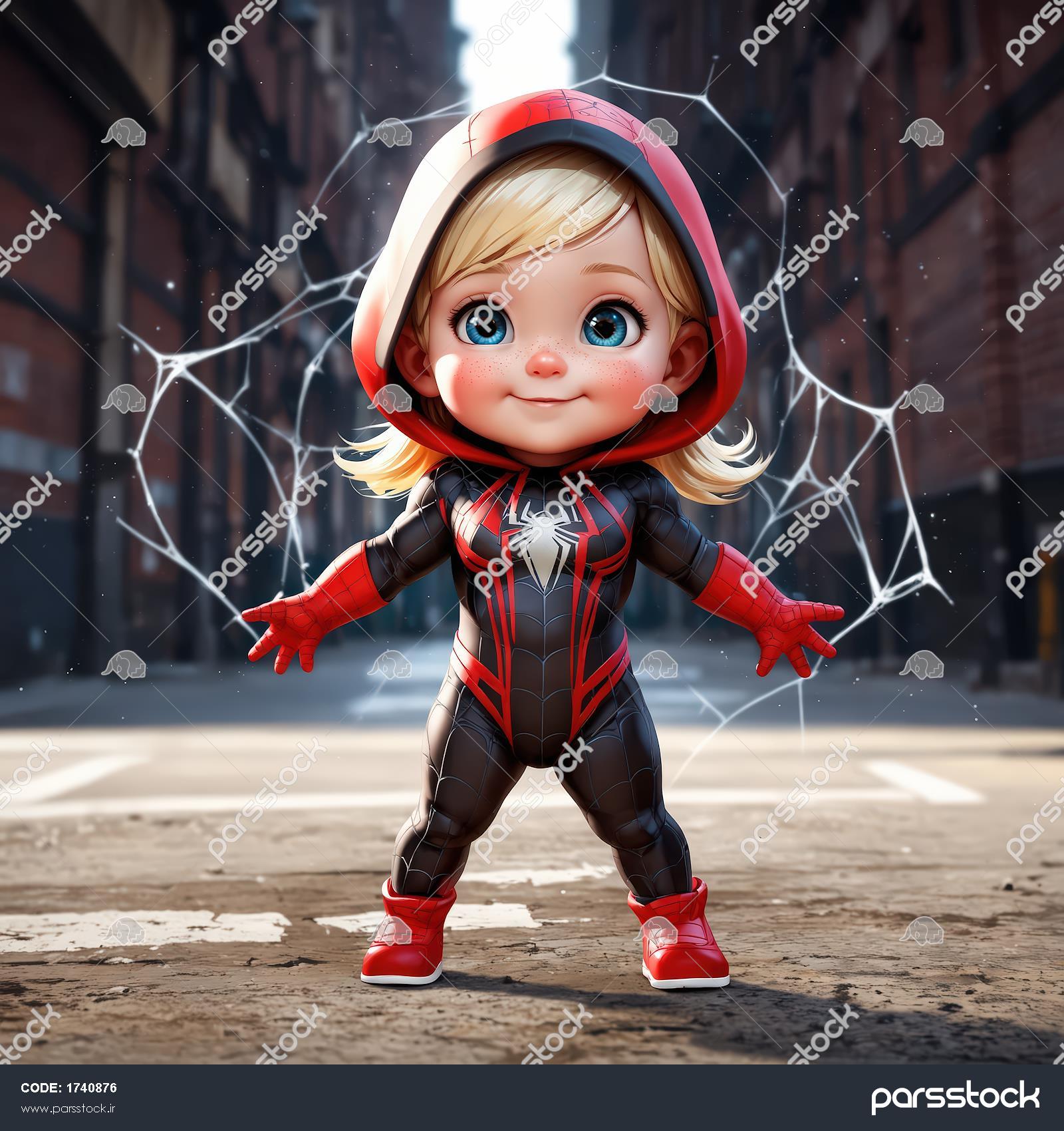 نوزاد دختر اسپایدرمن در خیابان شهر، تصویر فانتزی و کارتونی با پس‌زمینه تار عنکبوت، مناسب چاپ دکوراتیو