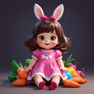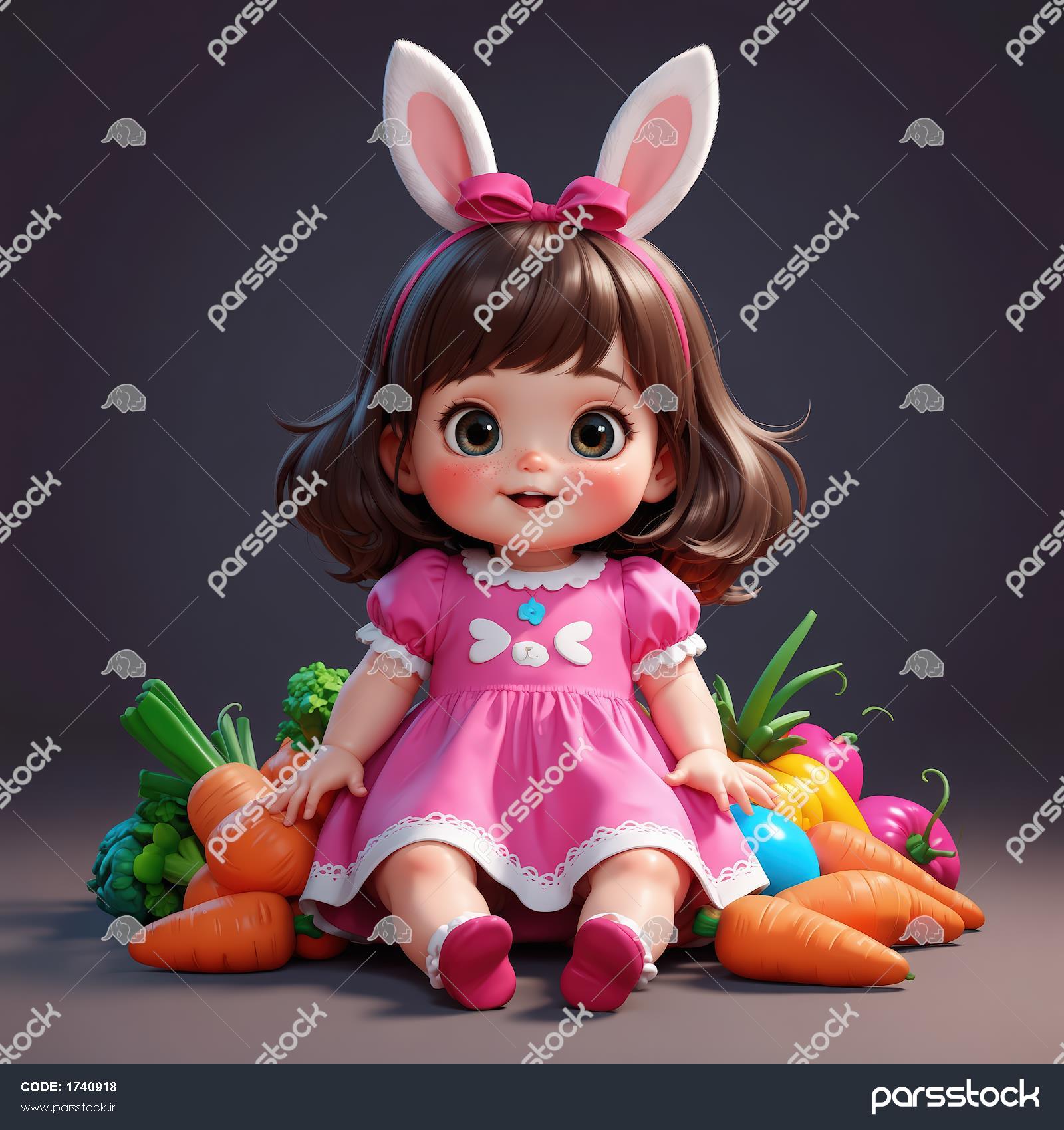 تصویر سه بعدی عروسک دختر با تم عید پاک، سبزیجات و هویج