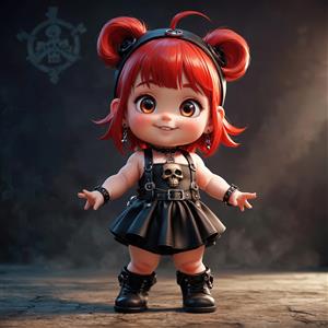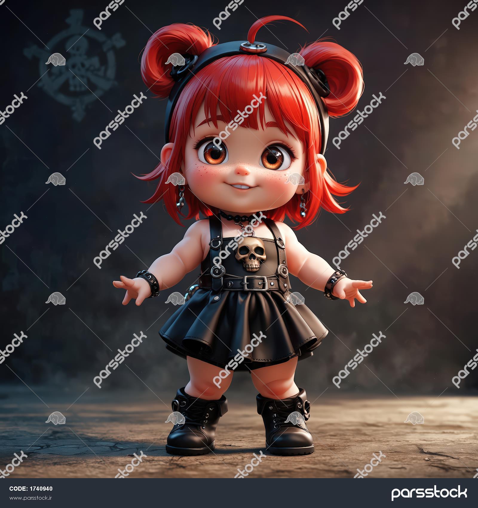 عروسک چیبی دختر مو قرمز با لباس راک، جوراب شلواری و پس‌زمینه صنعتی تاریک