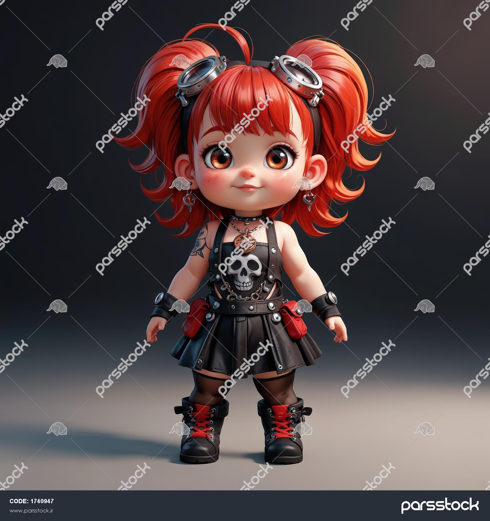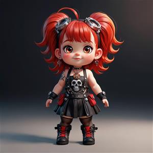 عروسک چیبی دختر با موی قرمز، عینک خلبانی و لباس راک مشکی، مناسب چاپ