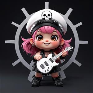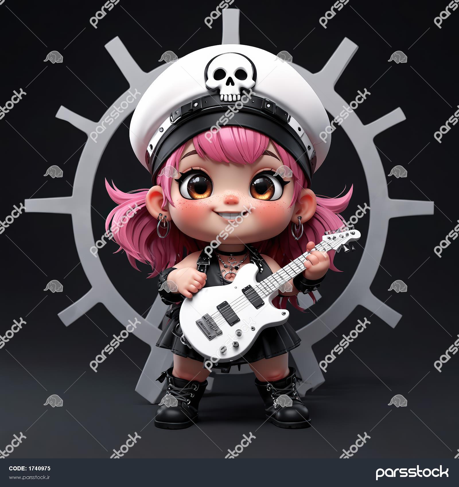 عروسک چیبی دختر راک با کلاه کاپیتانی اسکلتی، گیتار سفید و پس‌زمینه صنعتی