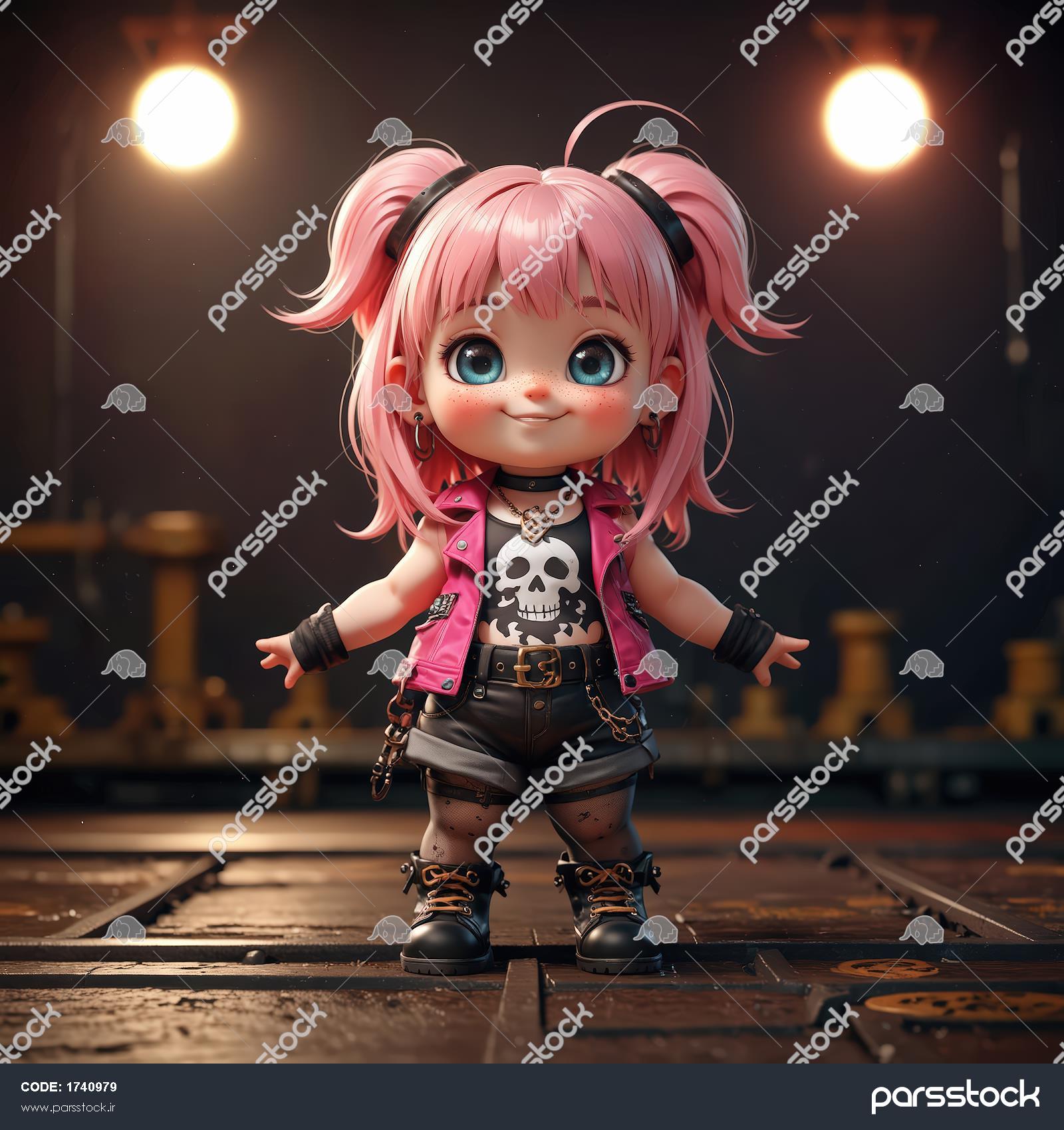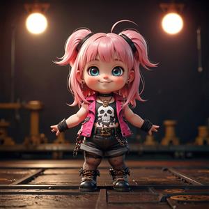 عروسک چیبی دختر با ژاکت صورتی، تیشرت اسکلت و استایل راک در فضای صنعتی