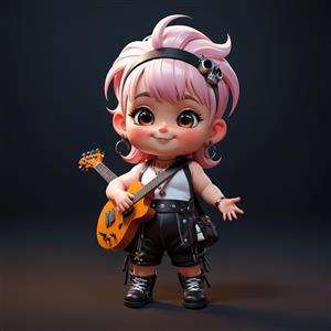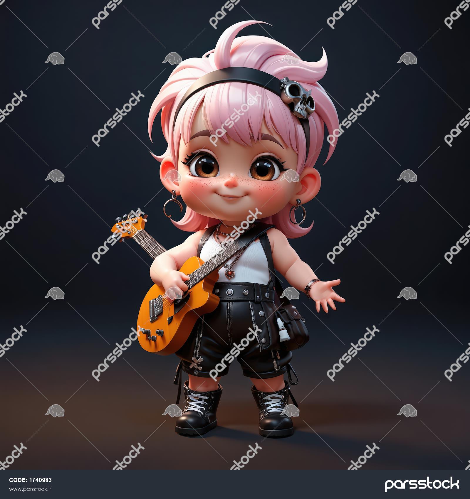 عروسک دختر راکر چیبی با گیتار آکوستیک نارنجی و لباس مشکی و سفید