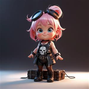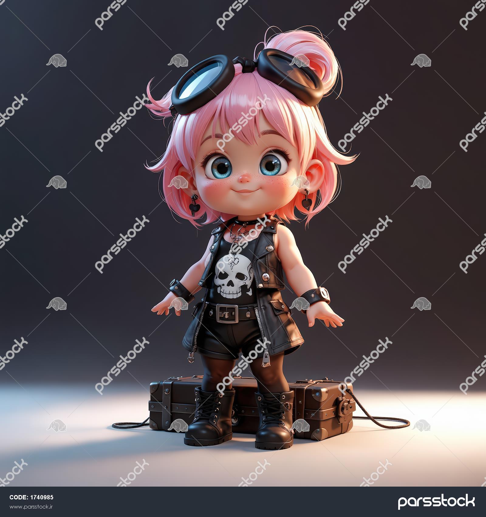 عروسک چیبی دختر با عینک خلبانی، لباس راک و چمدان، پس‌زمینه تیره استودیویی