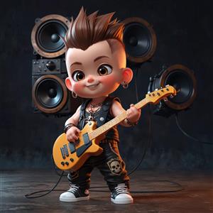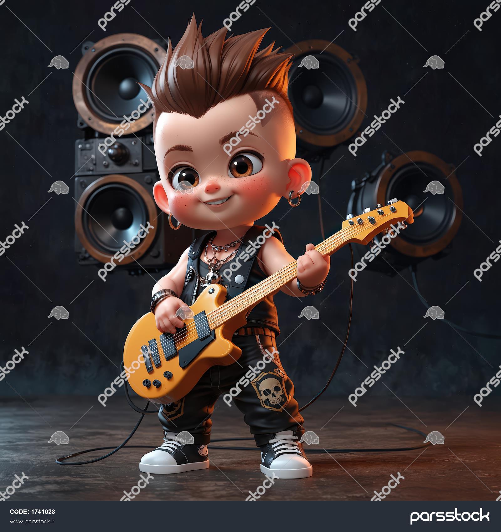 کاراکتر کودک پانک با موی سیاه، عینک و کت چرمی روی استند، تصویر پرتره موزیکال