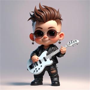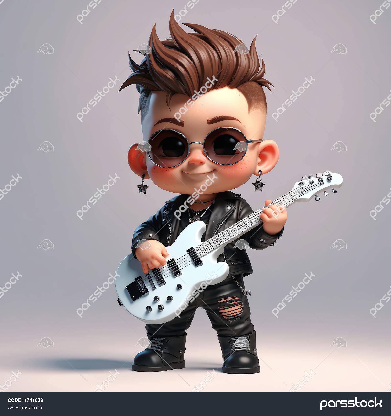 نوازنده گیتار الکتریک سفید با موی قهوه‌ای و عینک روی مو، در پس‌زمینه تیره استودیویی