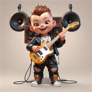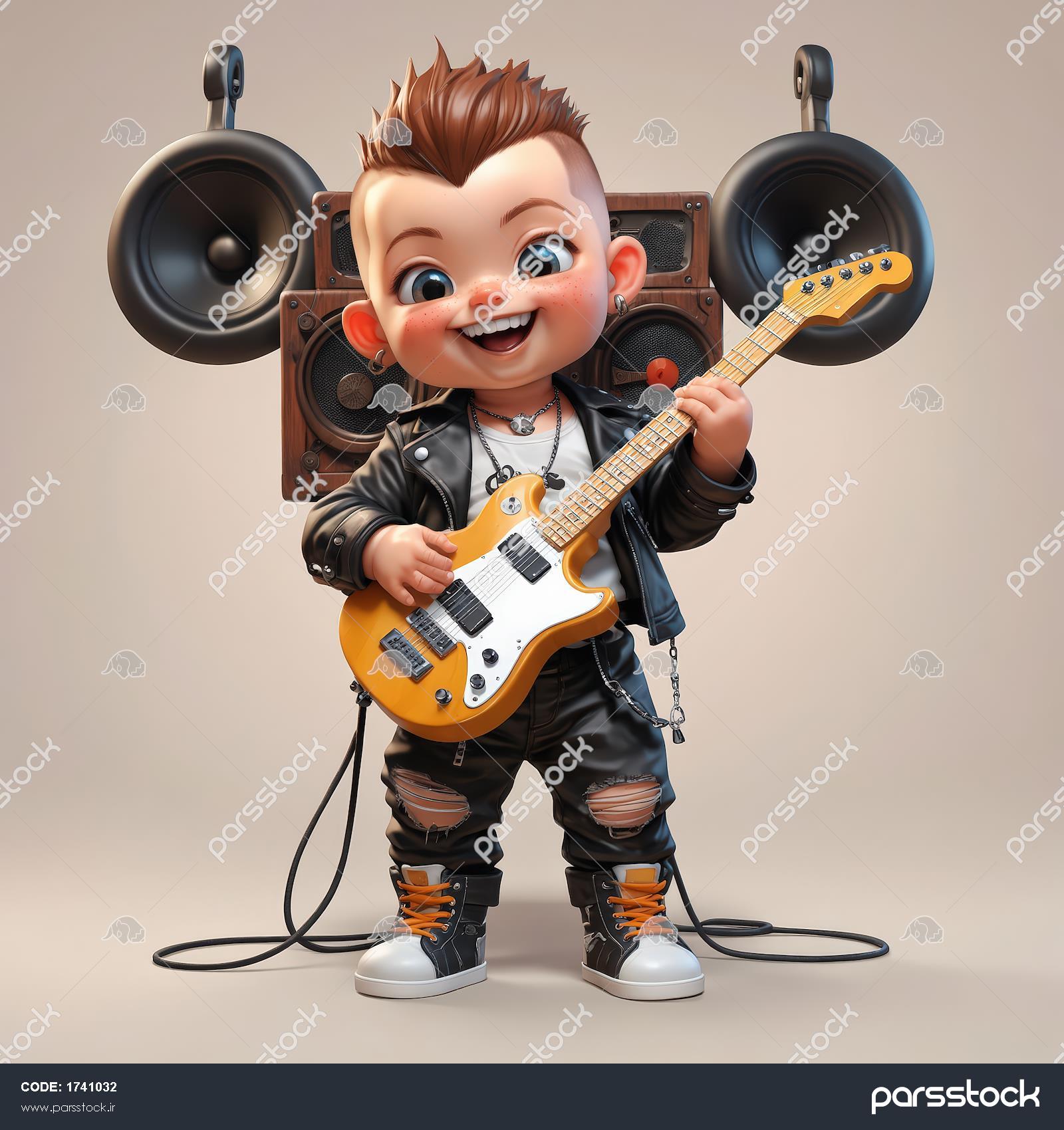 نوازنده گیتار الکتریک قرمز با موی نارنجی/قرمز، در مقابل اسپیکرهای بزرگ مشکی و نورپردازی