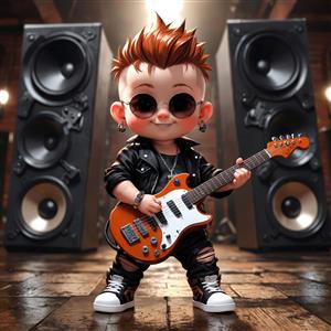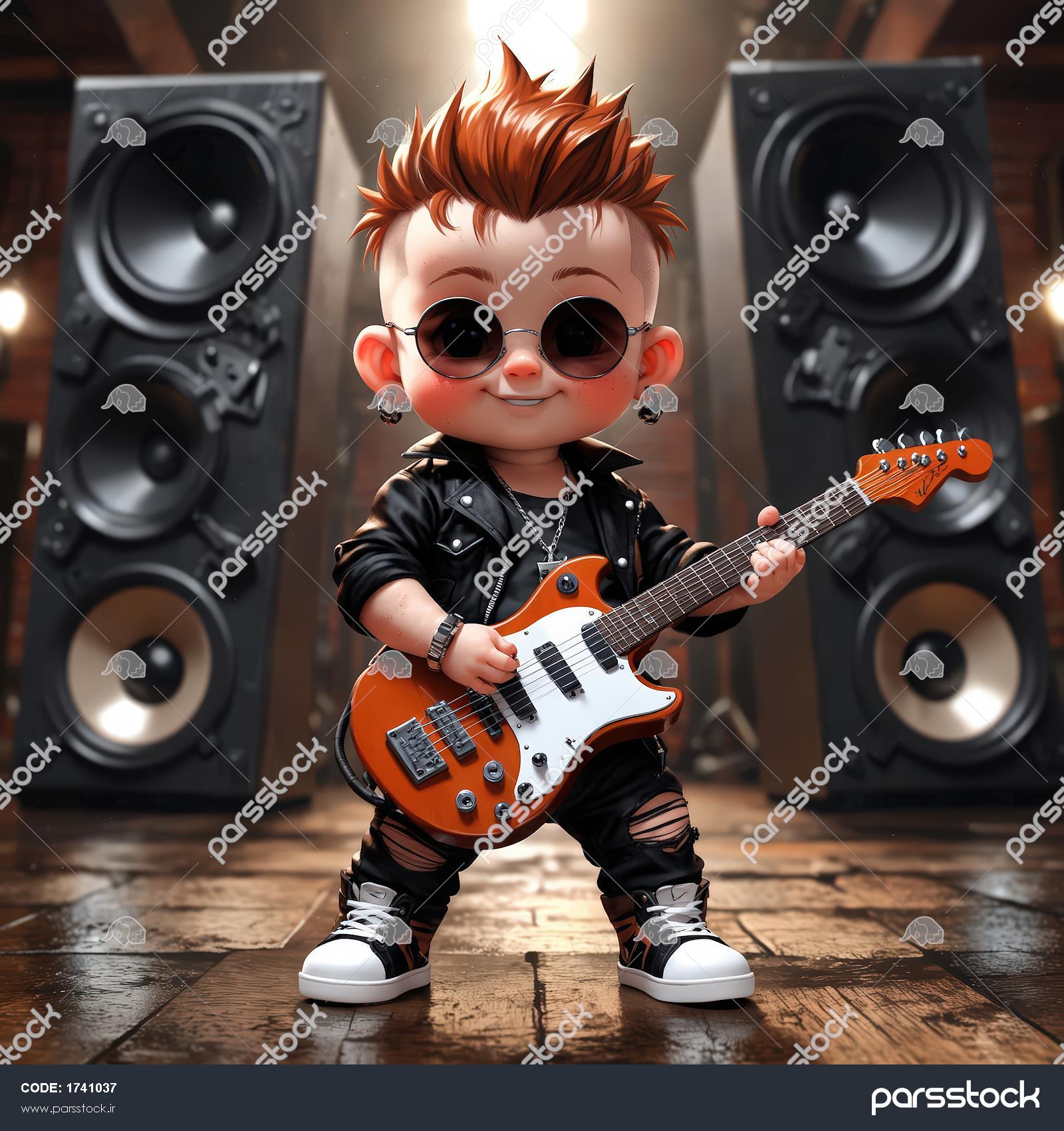 نوازنده گیتار الکتریک چوبی با موی قهوه‌ای، در مقابل اسپیکرهای بزرگ استودیویی