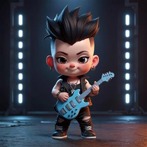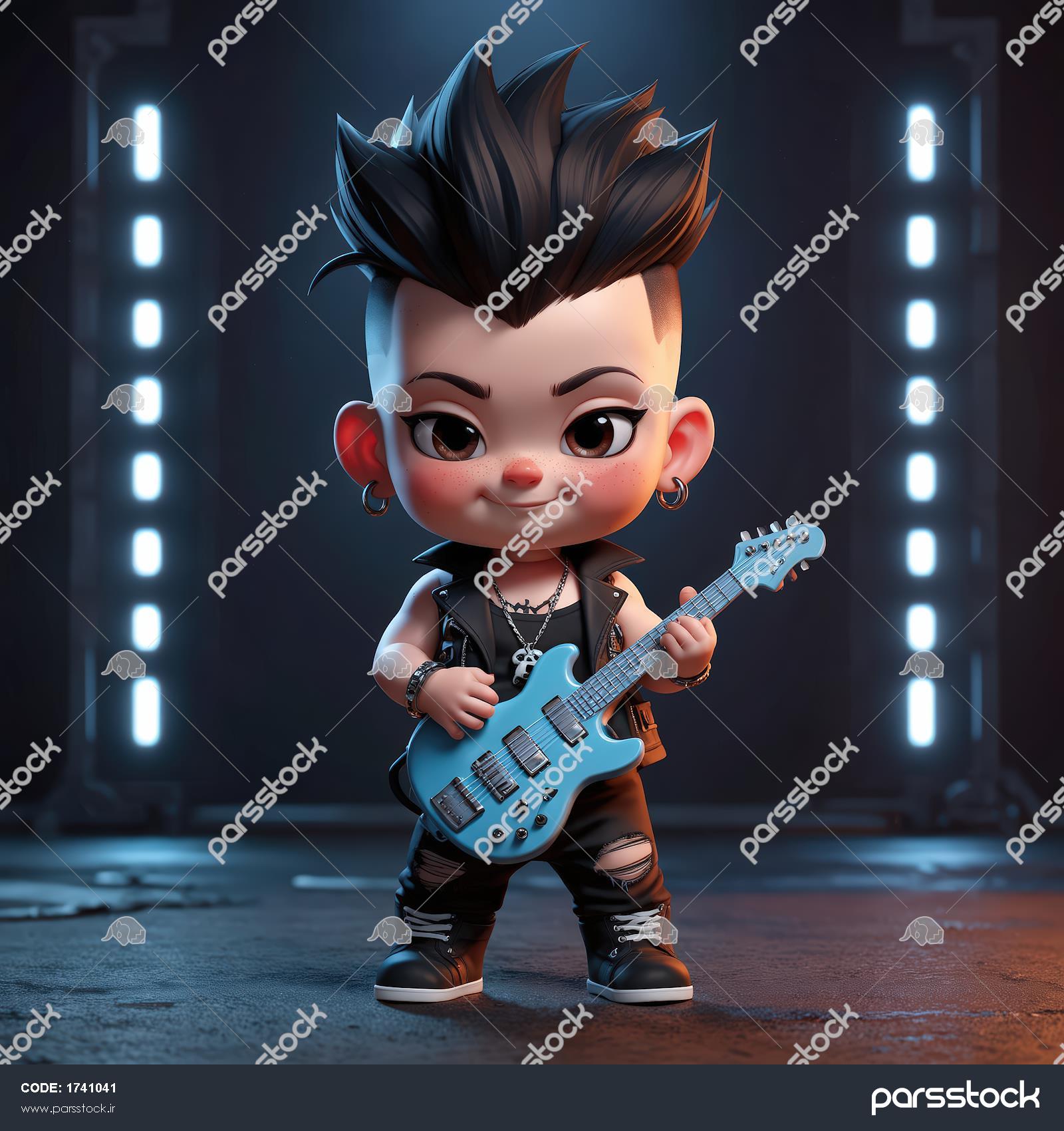 نوازنده گیتار الکتریک آبی با موی مشکی در پس‌زمینه نئونی با نوارهای نورانی، طرح کنسرت