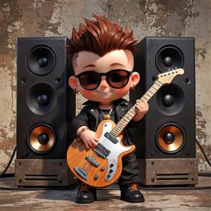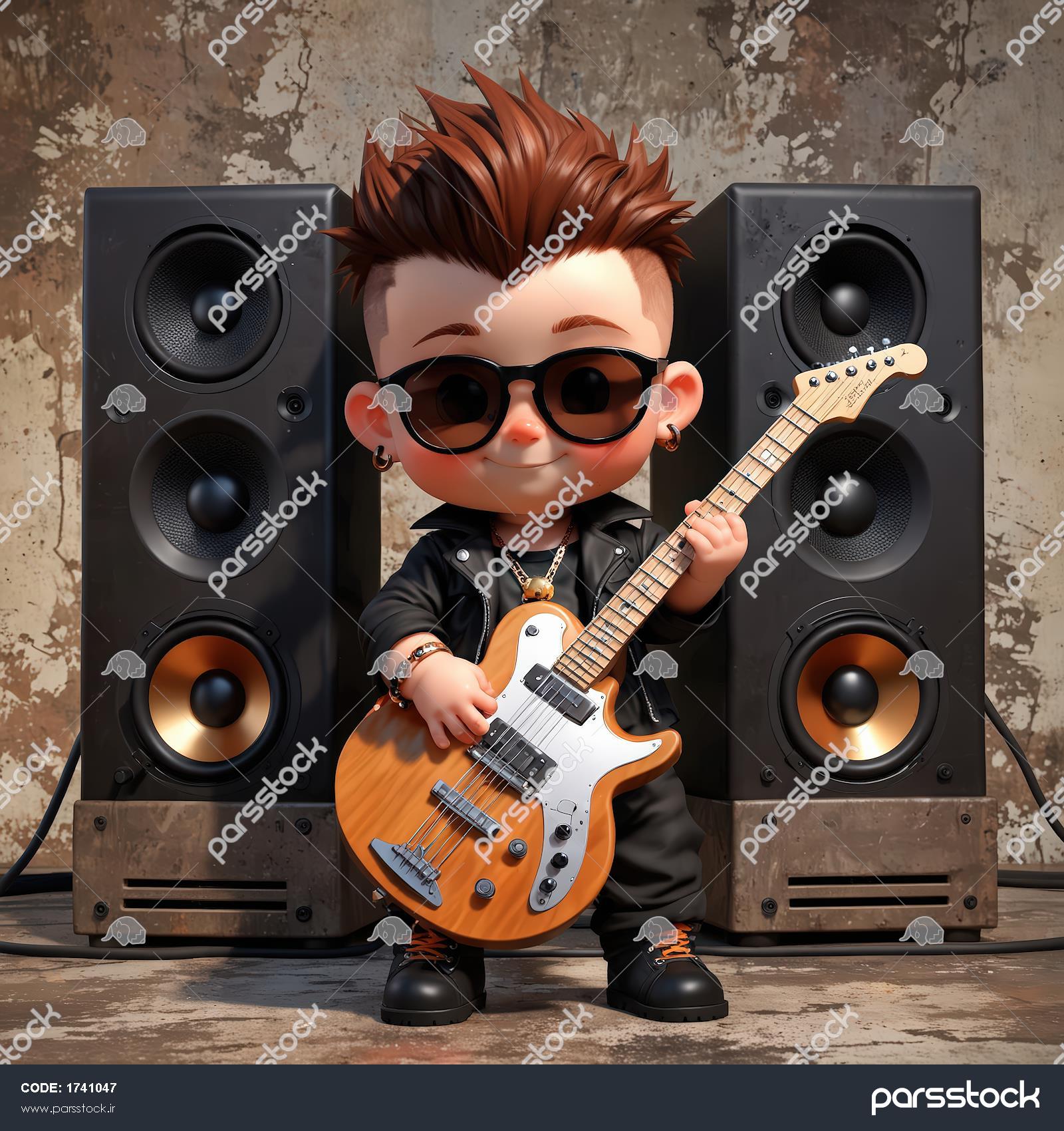 نوازنده گیتار الکتریک چوبی با موی قهوه‌ای در مقابل اسپیکرهای مشکی، تصویر استودیویی
