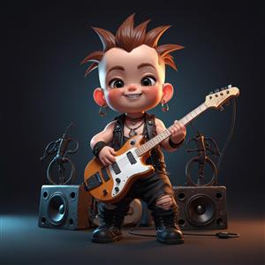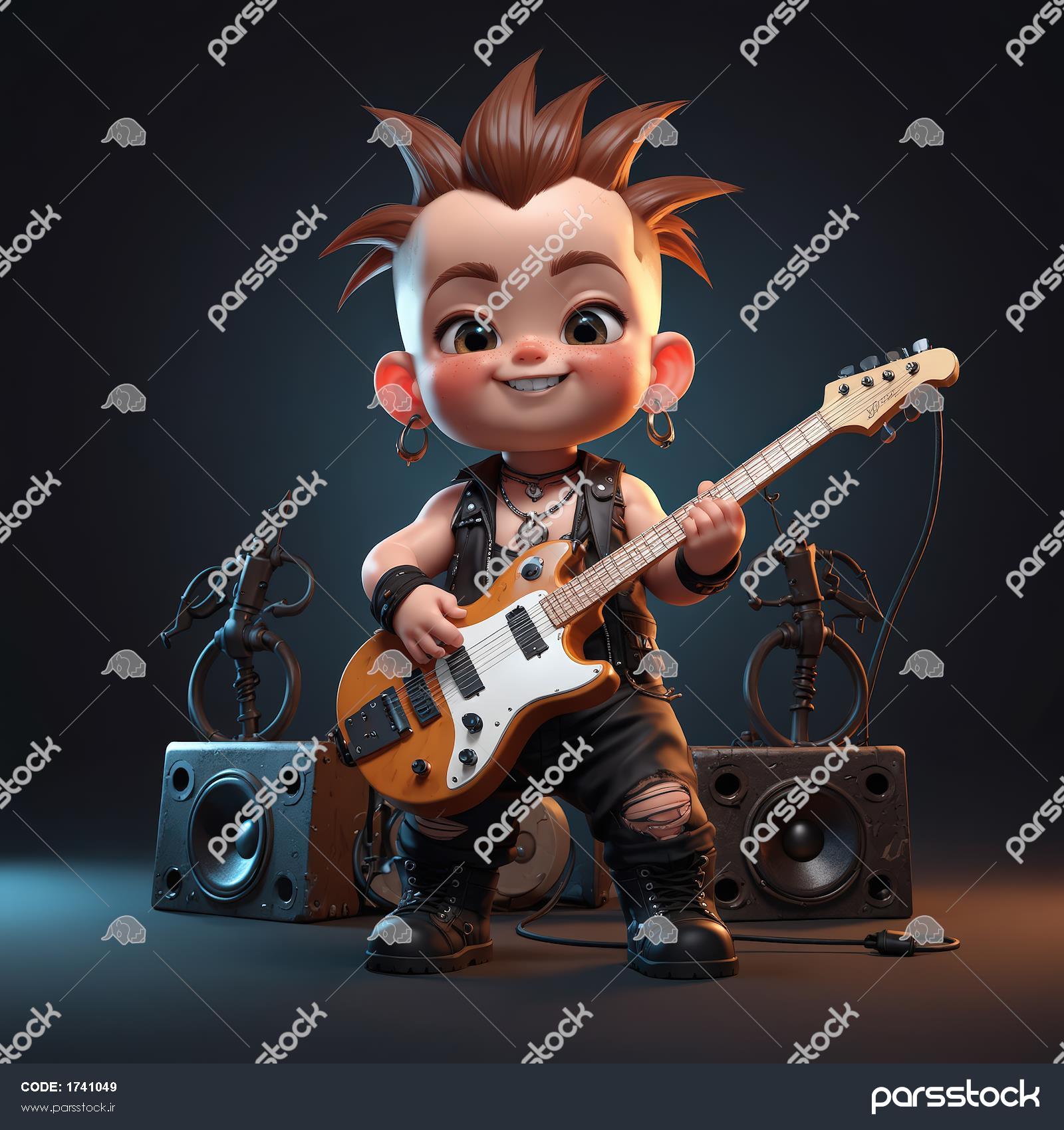 نوازنده گیتار الکتریک کارتونی مو بلوند با لبخند، در مقابل ست اسپیکرهای مشکی، تصویر شاد