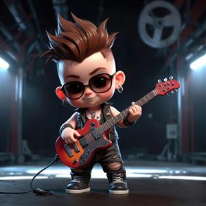 نوازنده گیتار بیس کارتونی با موی قهوه‌ای و عینک آفتابی، در حال اجرای موسیقی در پس‌زمینه صنعتی