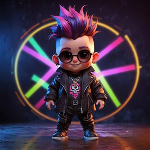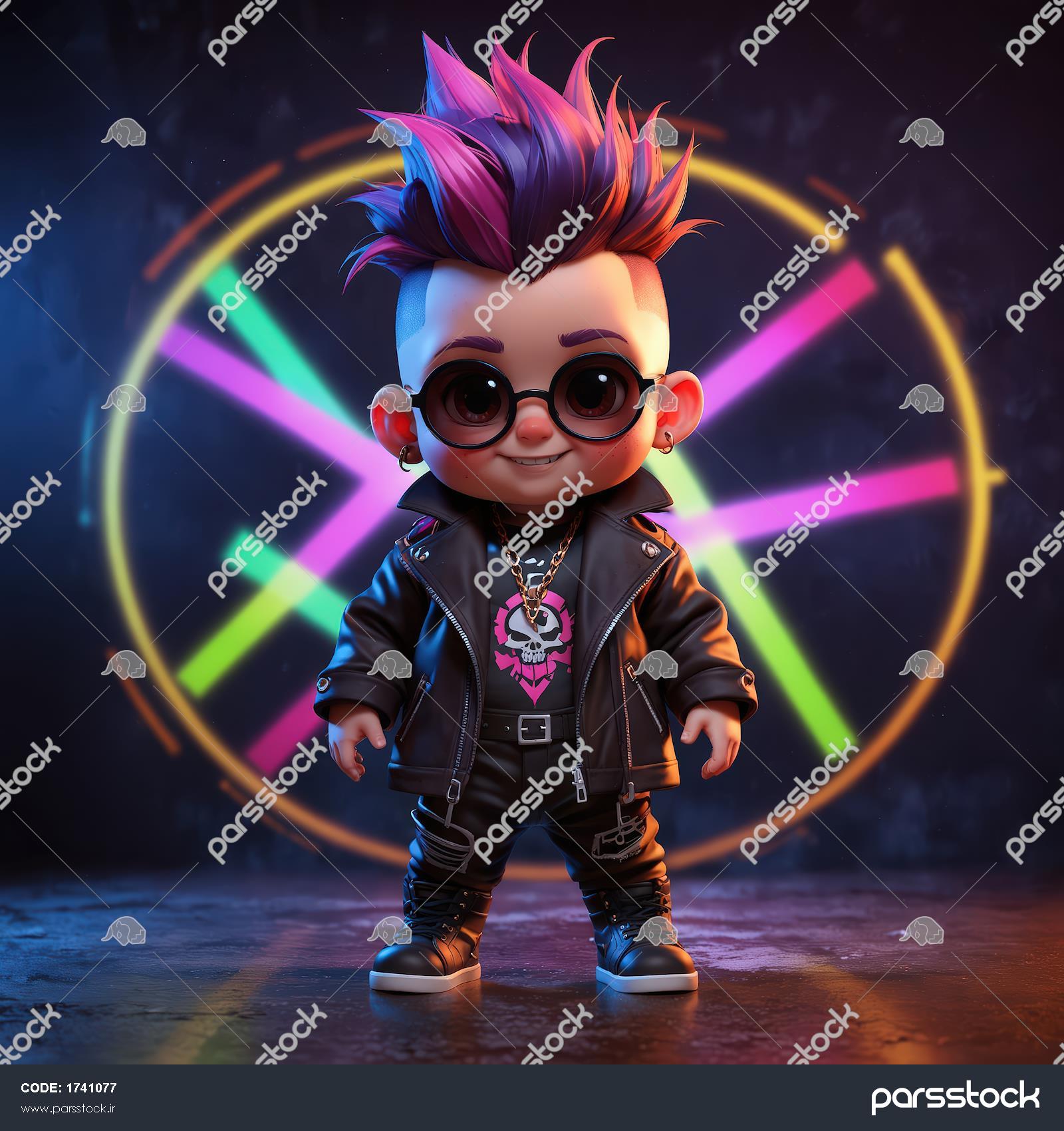 کاراکتر کارتونی مو بنفش در مرکز دایره نئونی چند رنگ متحرک، طرح گرافیکی دی‌جی و کلوپ شبانه
