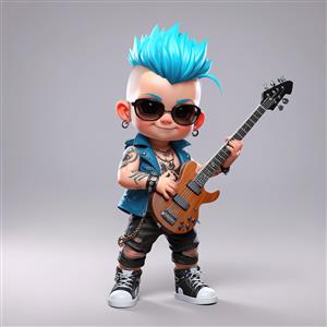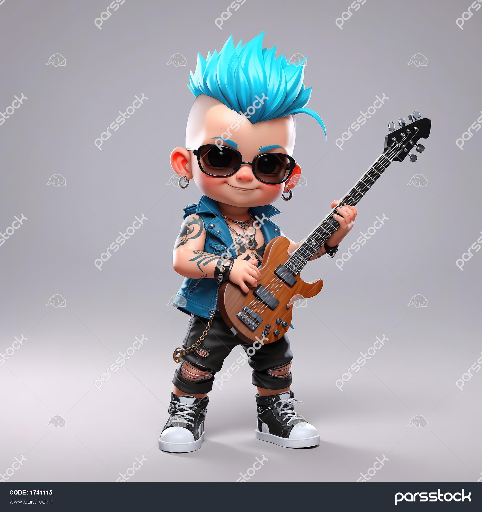 عکس کارتونی پسر راکر با گیتار الکتریک چوبی و موهای آبی، تصویر باکیفیت برای پوستر