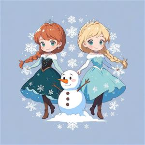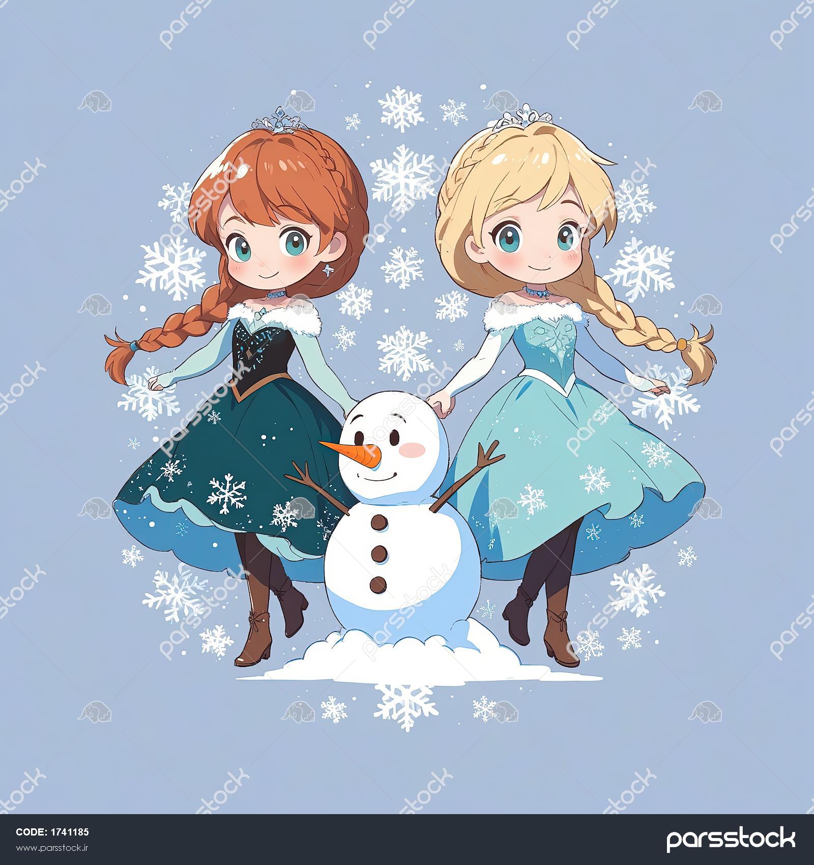 انیمیشن فروزن: السا و آنا با آدم برفی اولاف، وکتور بامزه در محیط برفی و آبی، طراحی چیبی
