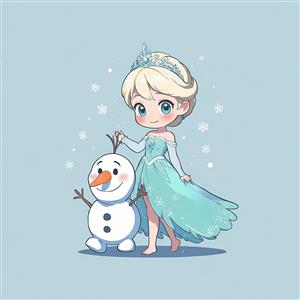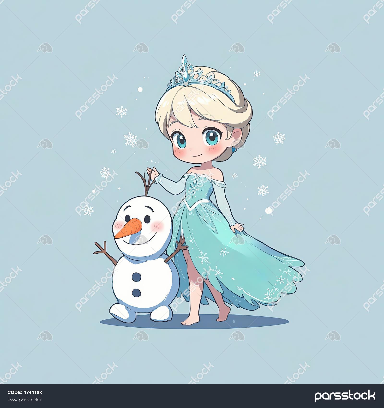 السا در لباس ملکه و اولاف، انیمیشن فروزن طرح وکتور با شنل بلند و تاج، پس‌زمینه آبی پاستلی