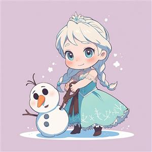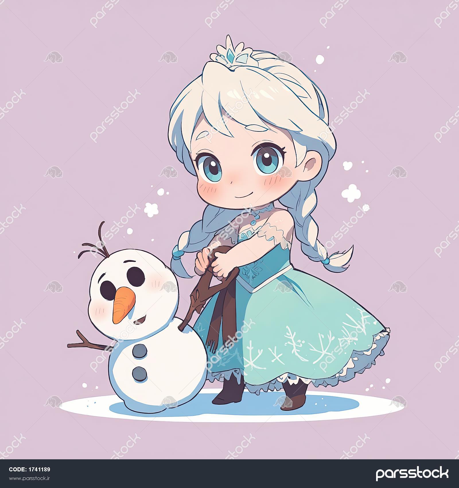 السا و اولاف با شال گردن، انیمیشن فروزن وکتور کیوت با موی نقره‌ای/یخی، پس‌زمینه بنفش/یاسی