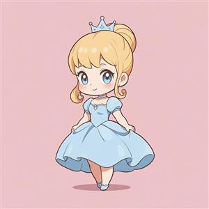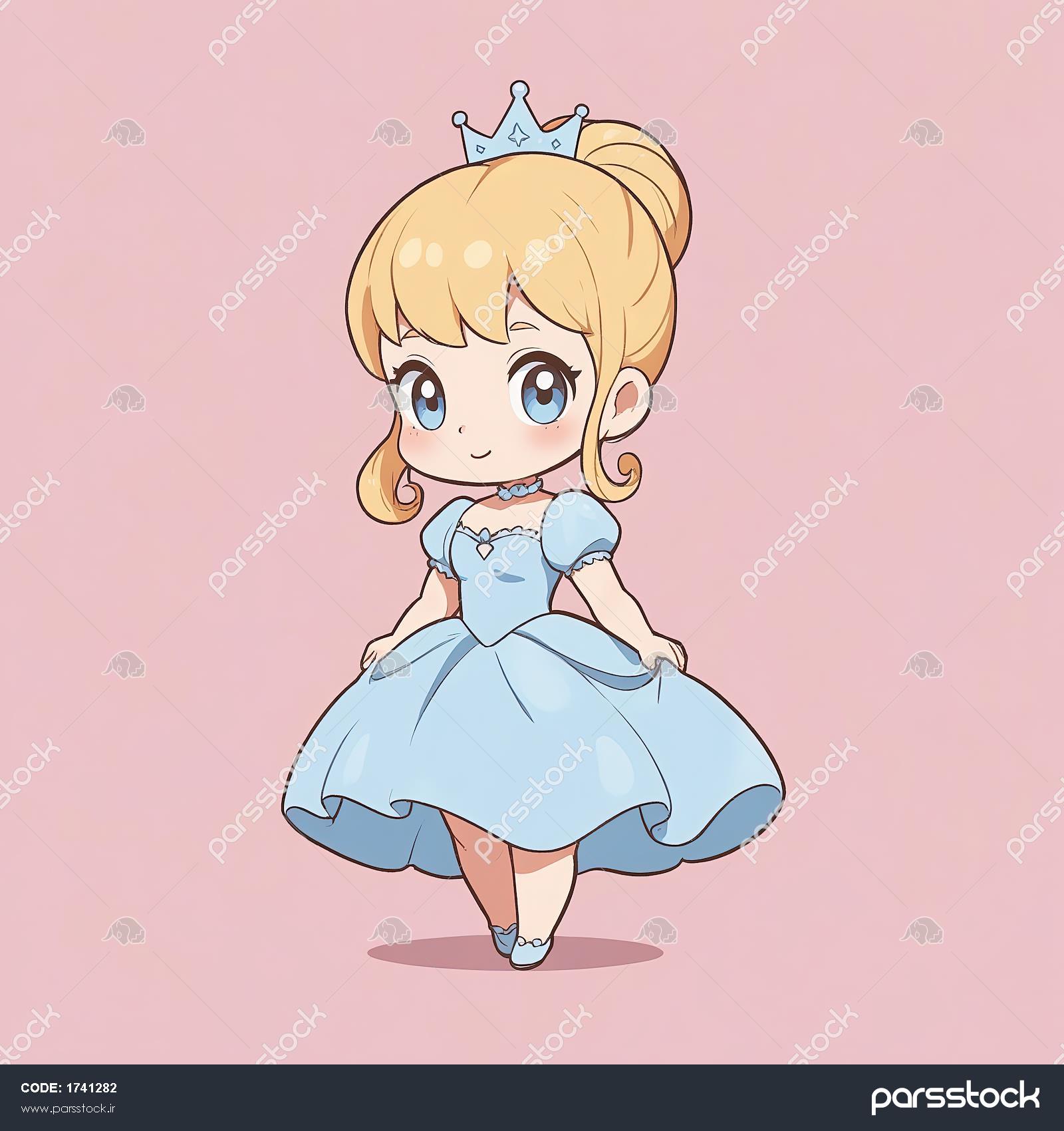 سیندرلا چیبی: تصویر تمام‌قد شاهزاده خانم بلوند با مدل موی جمع و لباس مجلسی آبی آسمانی