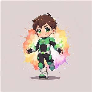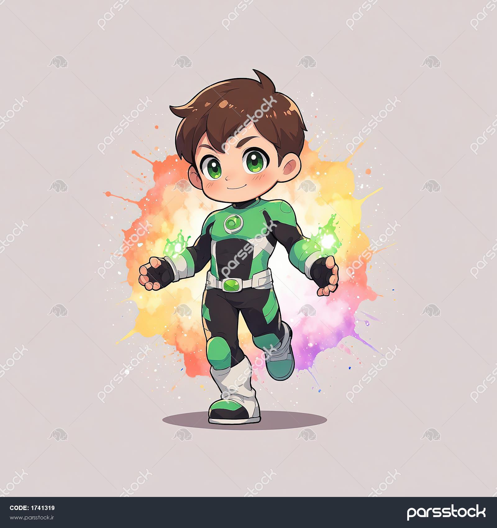 بن تنیسون ابرقهرمانی چيبی با پس زمینه آبرنگی رنگین کمانی وکتور