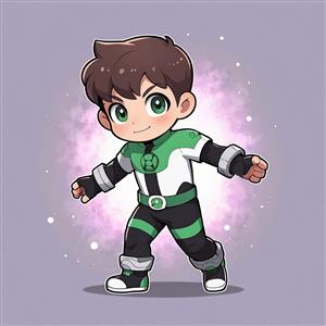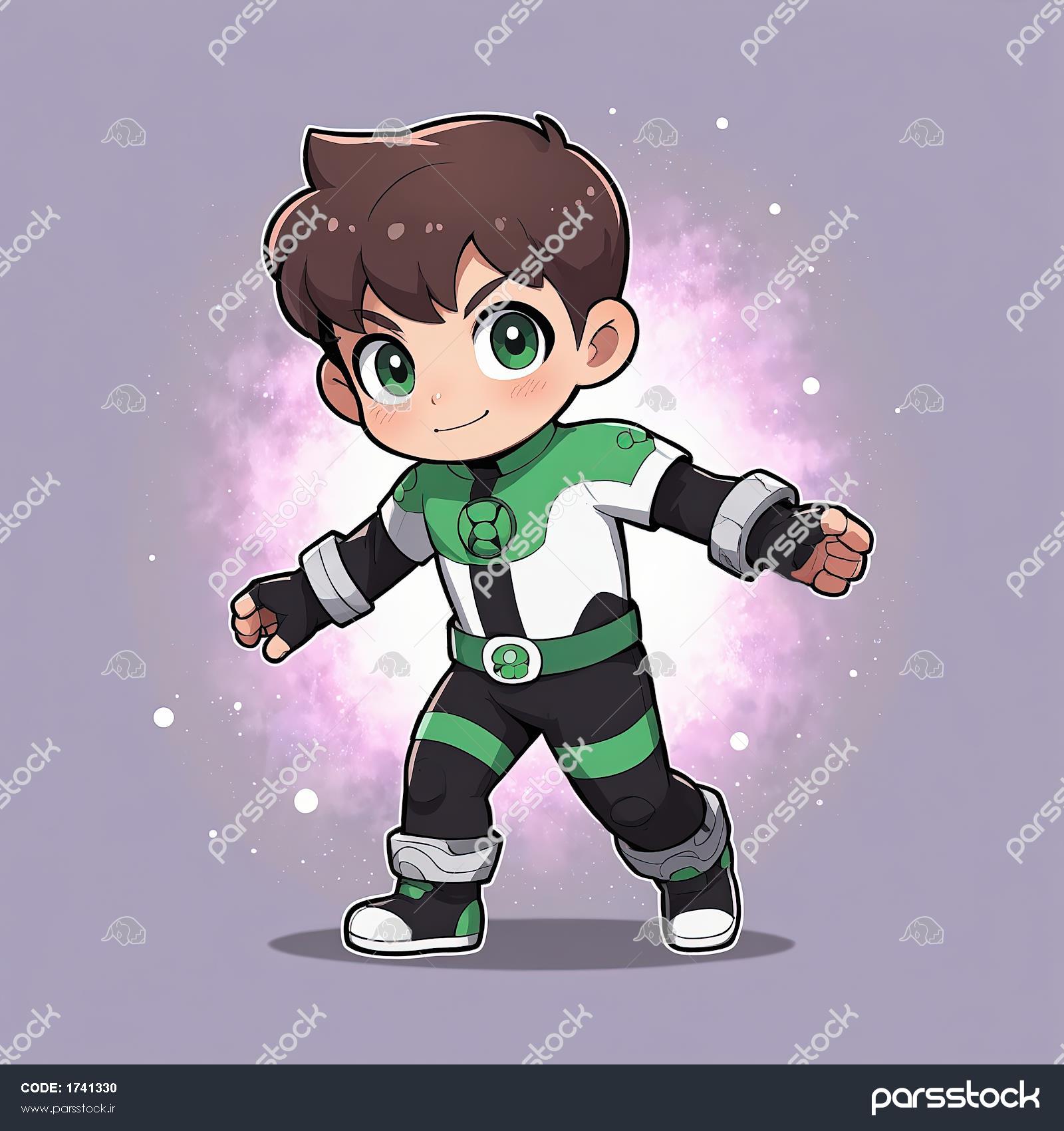 بن تنیسون لباس کلاسیک / بن 10 / تصویرسازی چیبی / بن تن در لباس کلاسیک سفید، سبز و مشکی در حال راه رفتن، با پسزمینه بنفش ملایم و ذرات نورانی و درخشش فانتزی