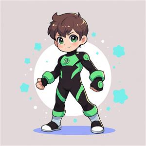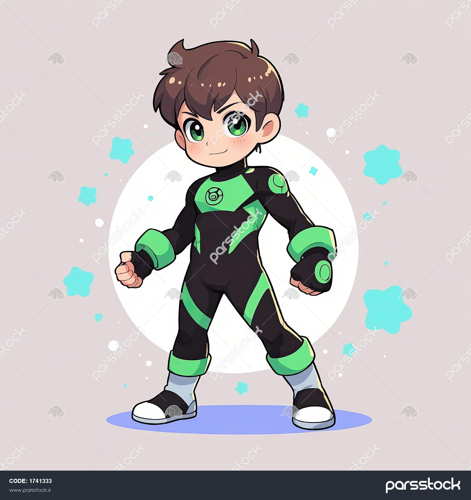 بن تنیسون 10 / بن 10 / تصویرسازی استیکر کارتونی / بن تن چیبی با لباس تمام مشکی و خطوط نئونی سبز، ایستاده با لبخند در مرکز دایره‌ای سفید و ستاره‌های آبی روشن
