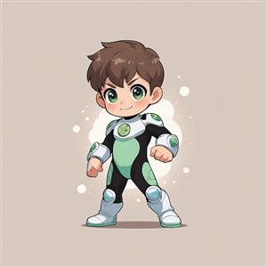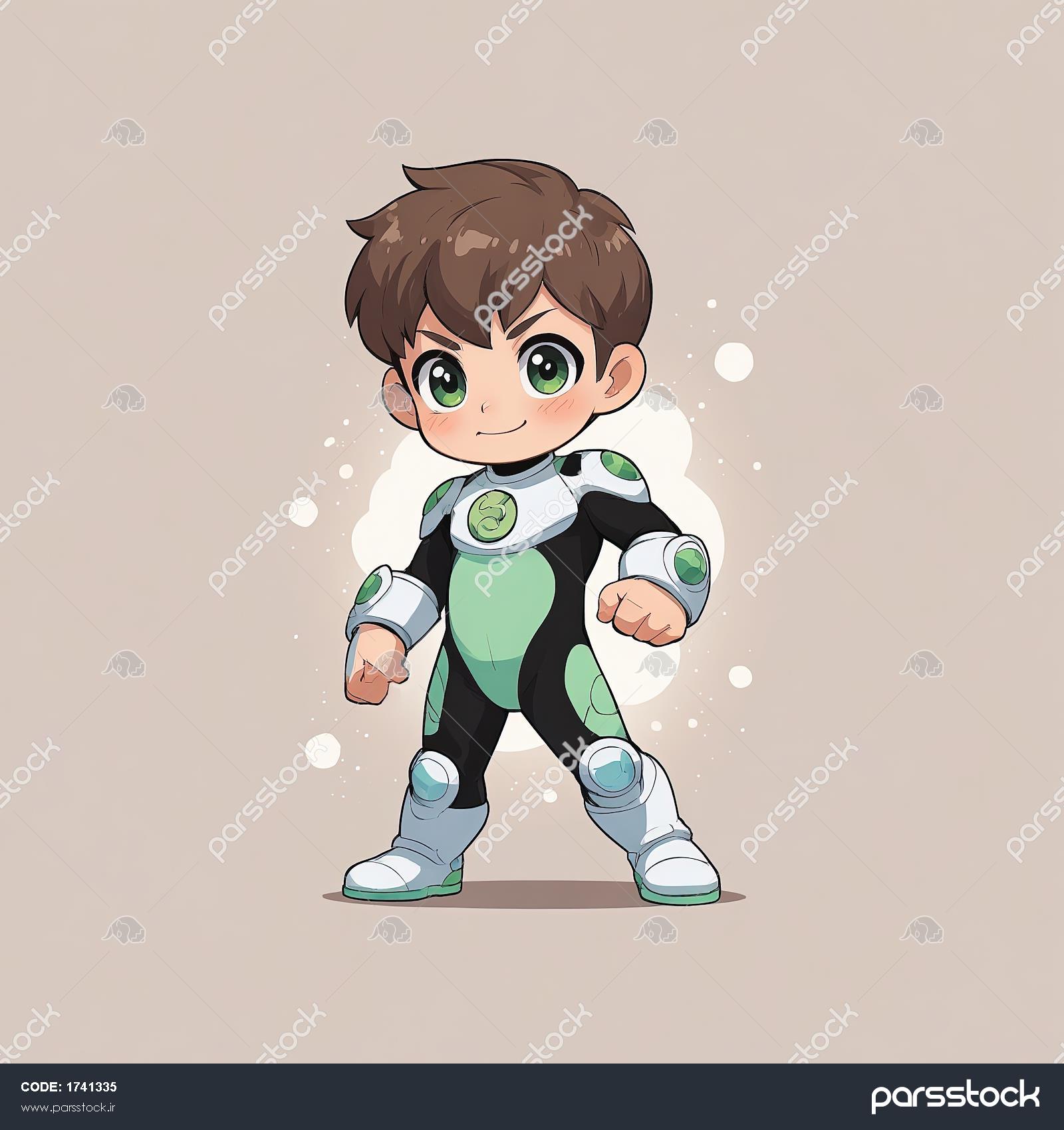 بن تنیسون / بن 10 / تصویرسازی دیجیتال کارتونی / تصویرسازی چیبی بن تن با لباس ابرقهرمانی فضایی سفید، مشکی و سبز، ایستاده با دستهای مشت شده، پسزمینه ساده بژ با افکتهای نور