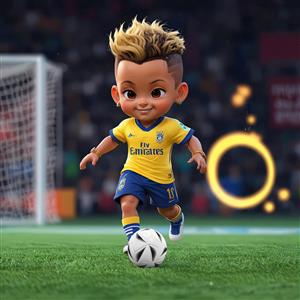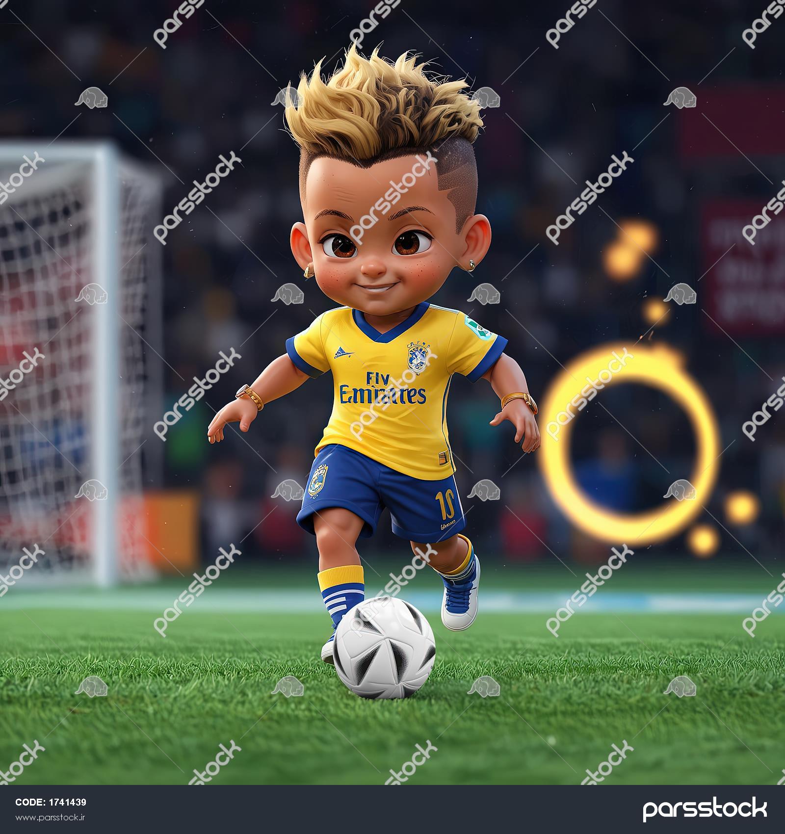 نیمار کارتونی در حال دریبلینگ توپ فوتبال در زمین چمن استادیوم