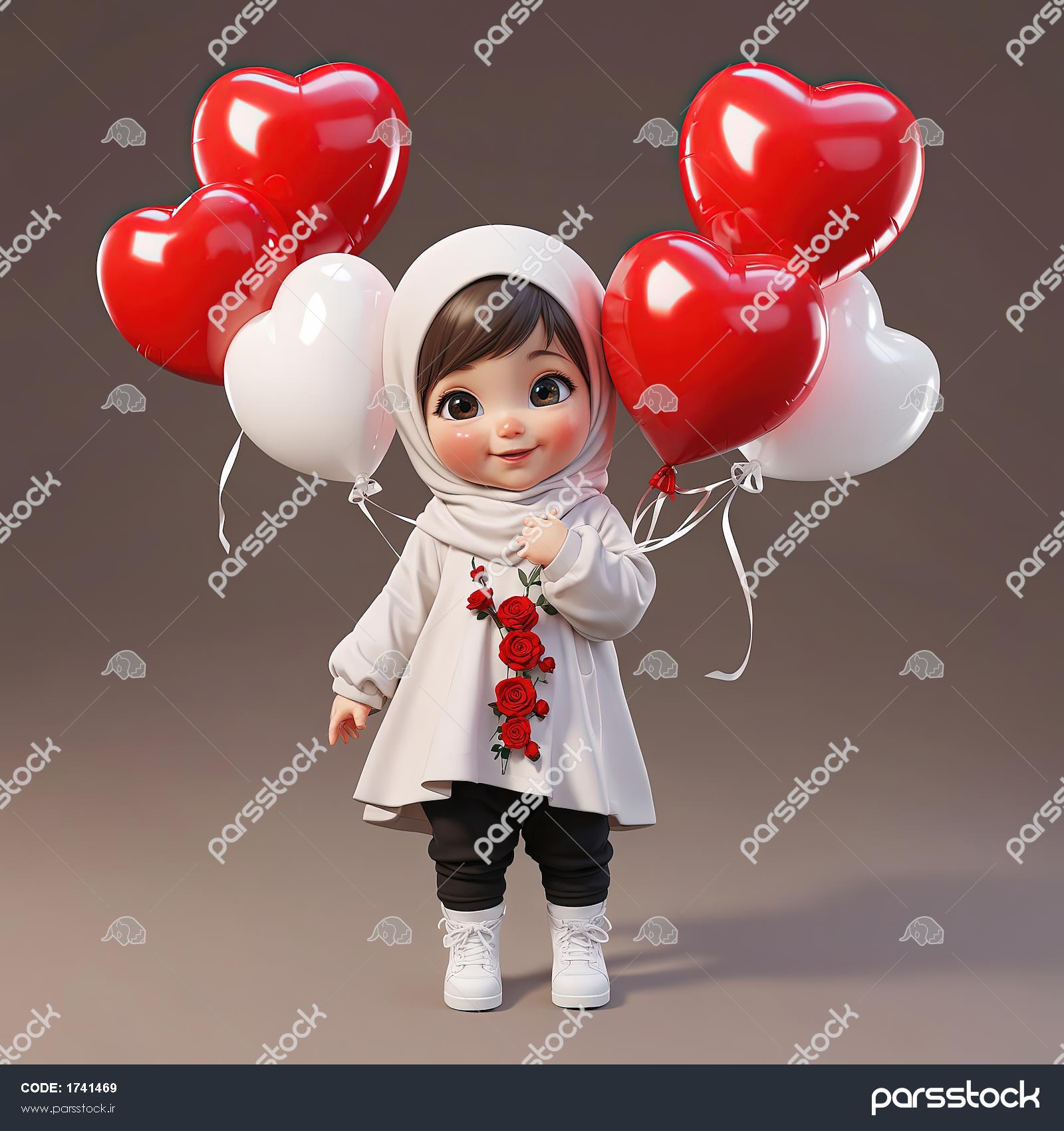 عکس کارتونی دختر محجبه با بادکنک‌های قلب قرمز و سفید برای چاپ طرح ولنتاین