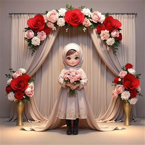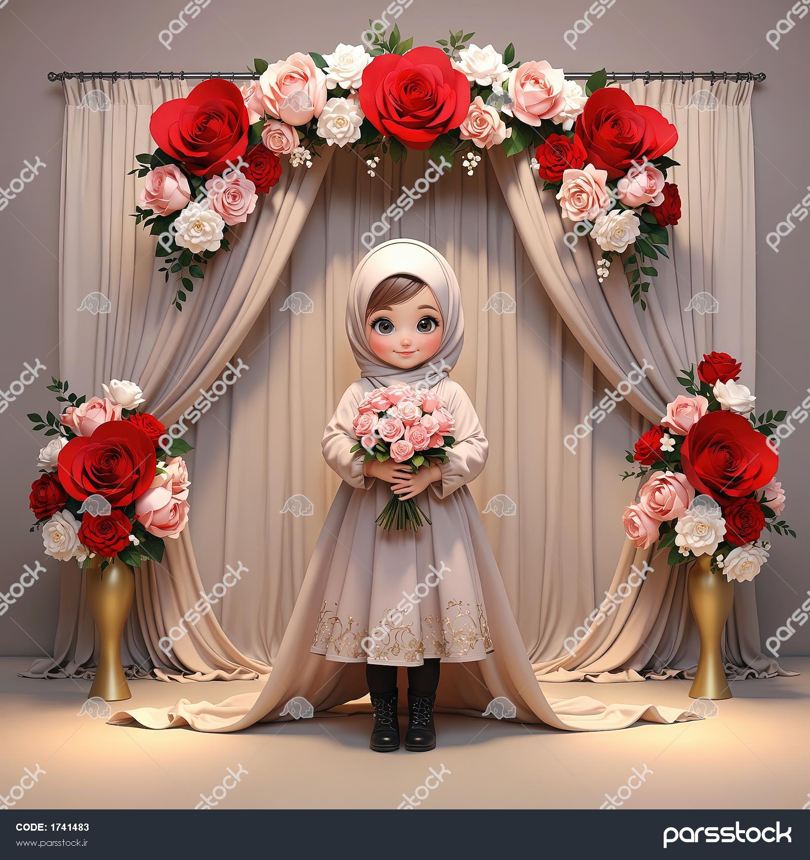 طرح دکوراتیو دختر محجبه با دسته گل صورتی، طاق گل بزرگ رز قرمز و بژ