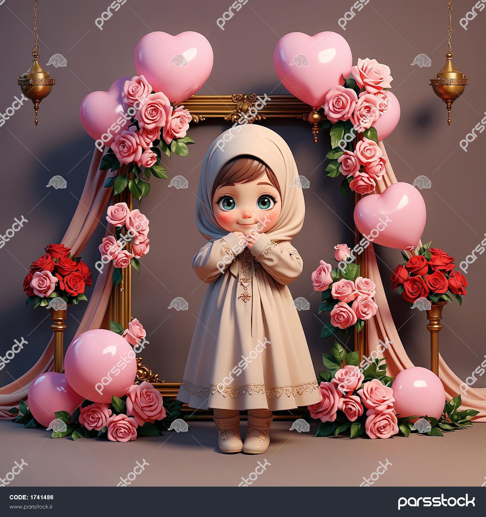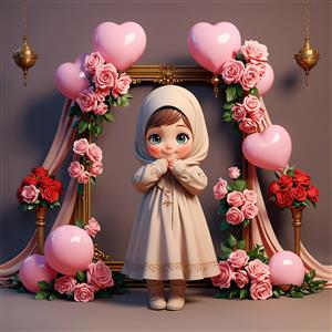 تابلو دکوراتیو با تم عاشقانه، دختر محجبه با دکوراسیون طلایی و بالون قلبی