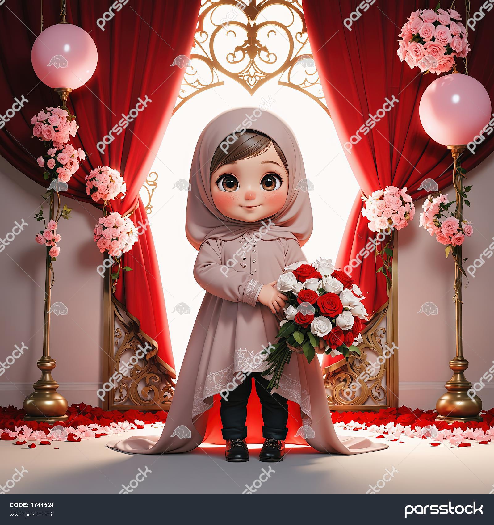 عروسک سه‌بعدی دختر محجبه با لباس قرمز و دسته گل (مخصوص جشن تکلیف)