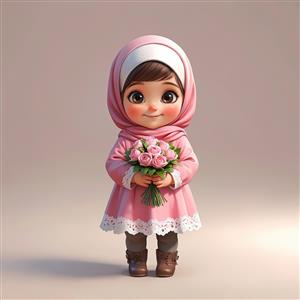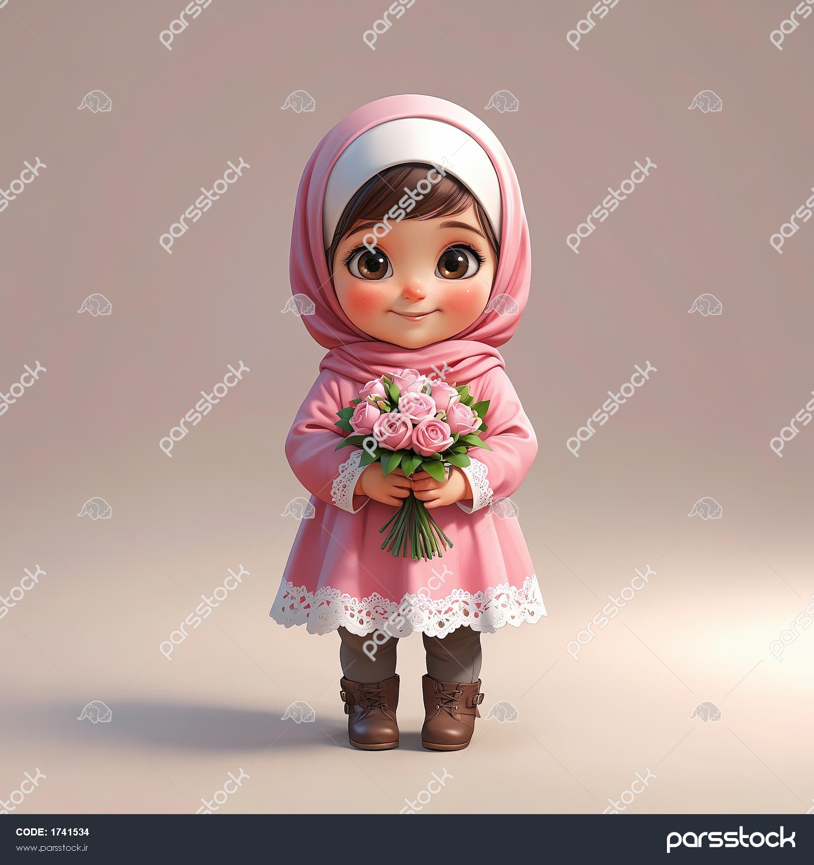 تصویر استوک دختر با حجاب و لباس صورتی و دسته گل رز صورتی (برای تبریک)