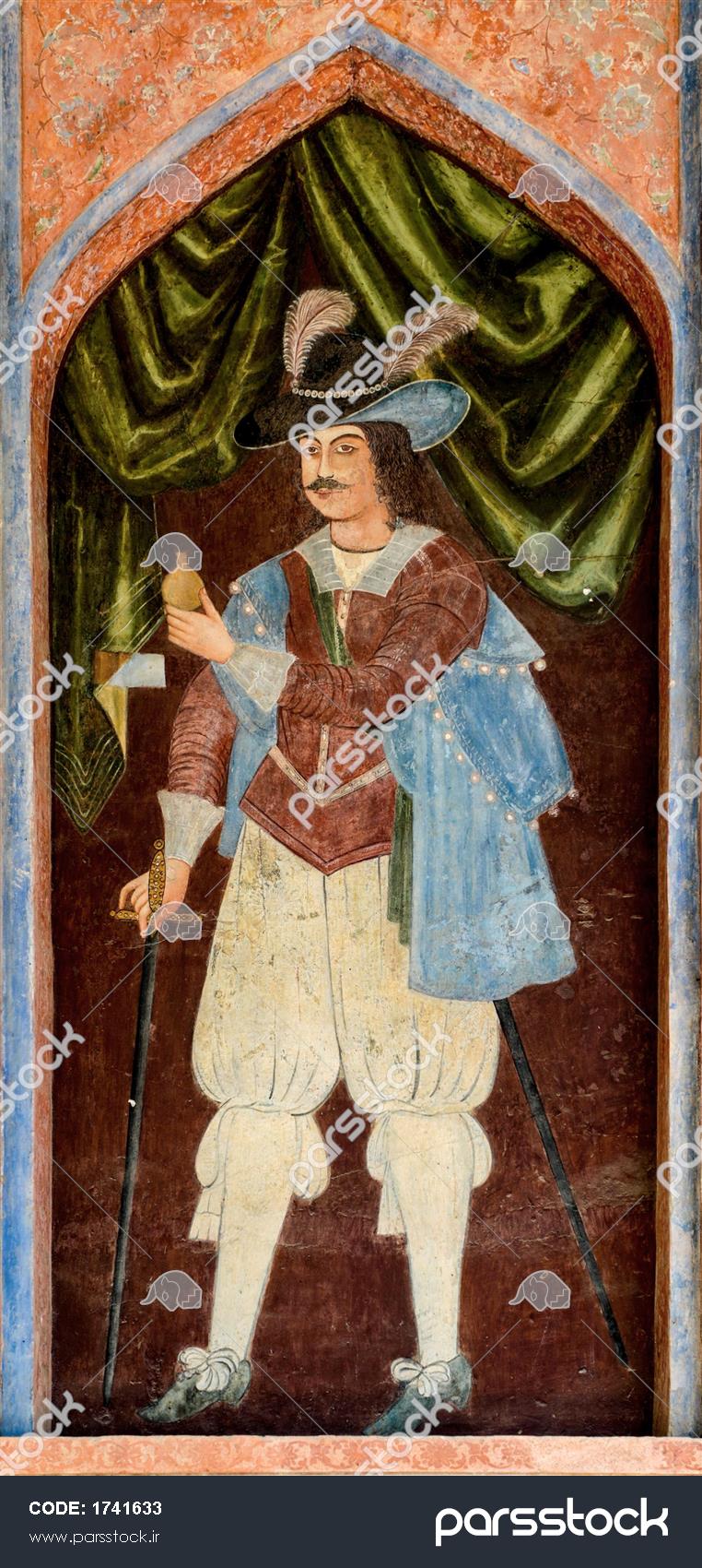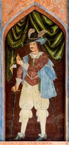 دیوارنگاره مرد اروپایی یا اشرافی قزلباش در طاقچه چهلستون (پرتره، کیفیت بالا، لباس صفوی)