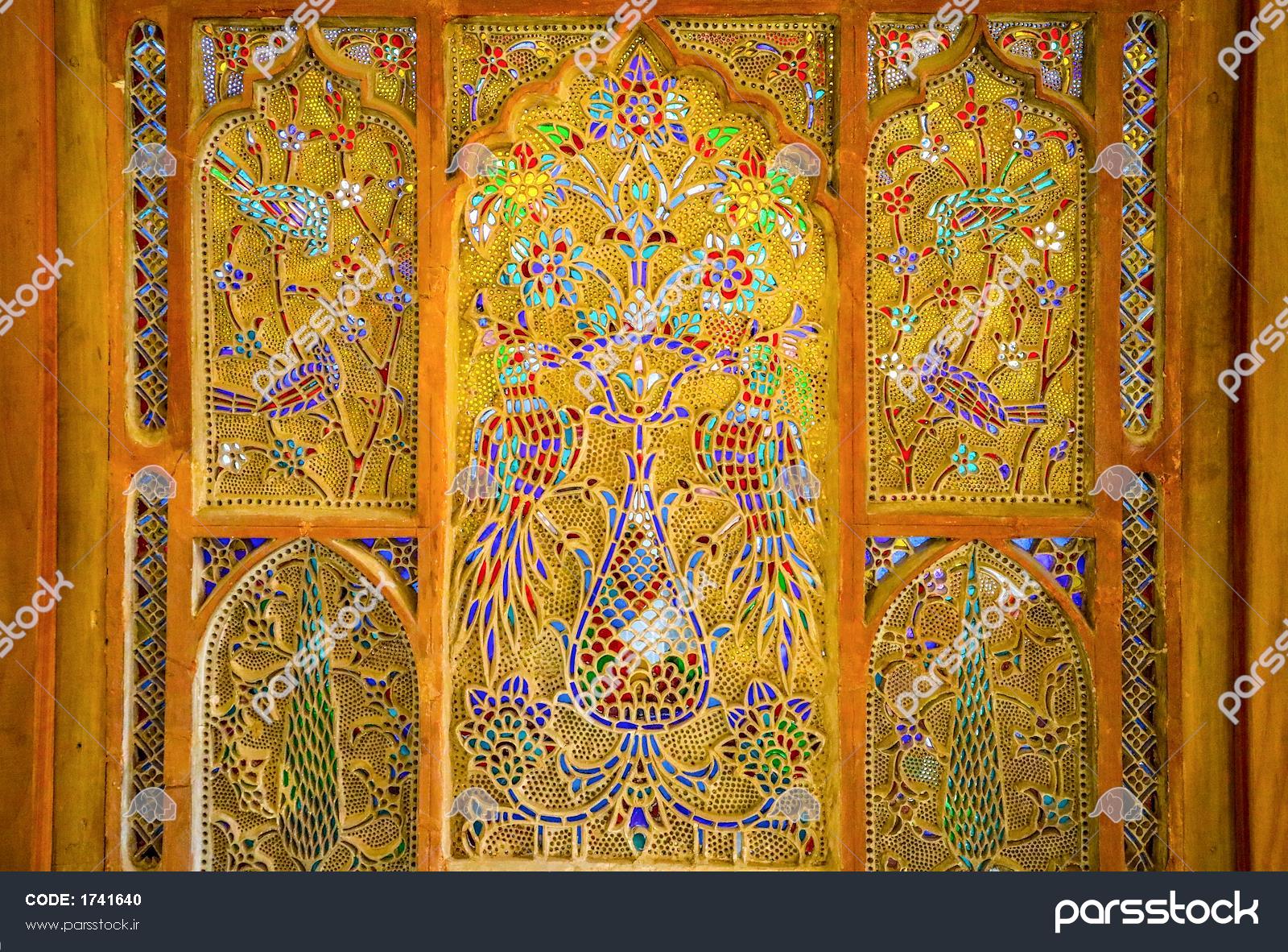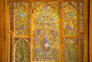 نمای نزدیک پنجره مشبک با نقوش رنگی و شیشه در چهلستون
