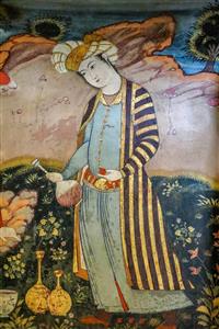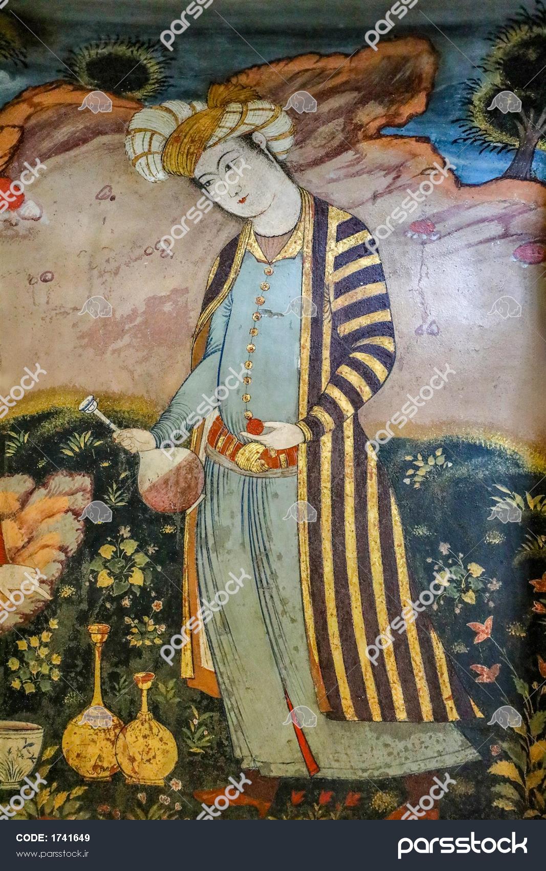 پرتره مرد صفوی با لباس راه‌راه و ظرف شراب در فضای باغ (مکتب اصفهان)