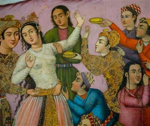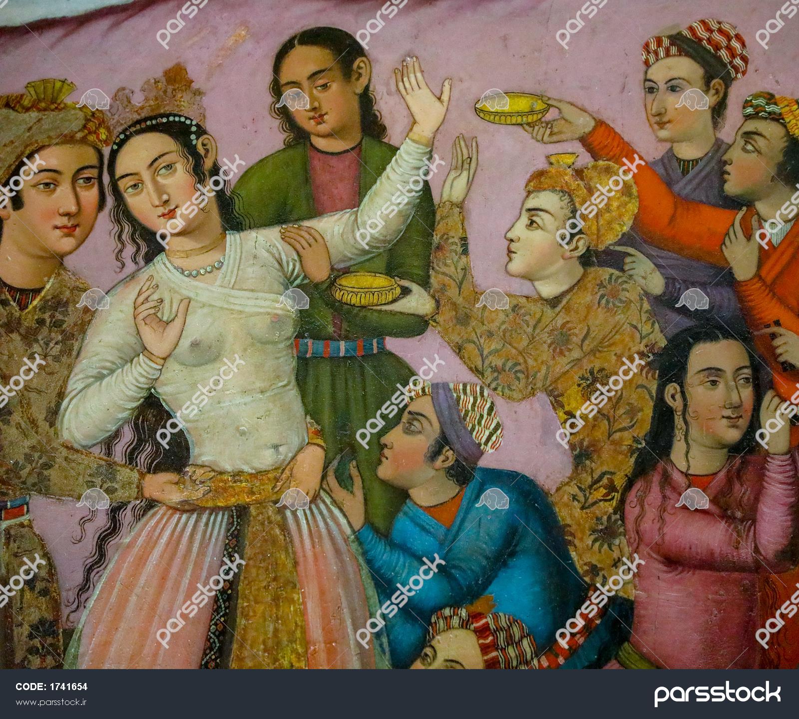 نقاشی دیواری زن در باغ کنار حوض و فواره کاخ چهلستون اصفهان پرتره زن اشرافی صفوی با لباس سنتی در میان پردههای تزئینی چهلستون پرتره مرد صفوی با لباس راهراه و ظرف شراب در فضای باغ (مکتب اصفهان) نقاشی منظره بزم و ملاقات عاشقانه در باغ (مکتب اصفهان) نقاشی بزم درباریان در فضای طبیعی چهلستون با پسزمینه کوهستانی نقاشی دیواری عالی قاپو اصفهان، تصویر زن با لباس سنتی مینیاتور باکیفیت از نقاشیهای اروپایی دیواری چهلستون اصفهان مناسب پوستر و تابلو تصویر نمای نزدیک از بزم شاهی با شاه و مهمانان و رقص زن صفوی در نقاشی چهلستون تصویر رقص زنان (رقاصهها) و نوازندگان در مجلس بزم شاهی در نقاشی دیواری چهلستون نقاشی دیواری زن و مرد ایرانی در عالی قاپو، شاهکار صفوی نمایش همه