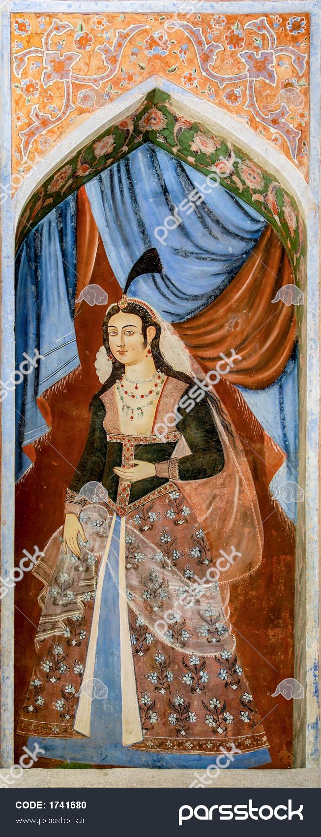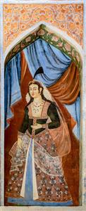 پرتره زن اشرافی صفوی با لباس سنتی در میان پرده‌های تزئینی چهلستون