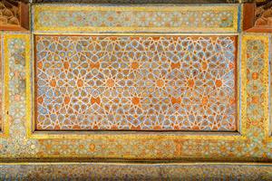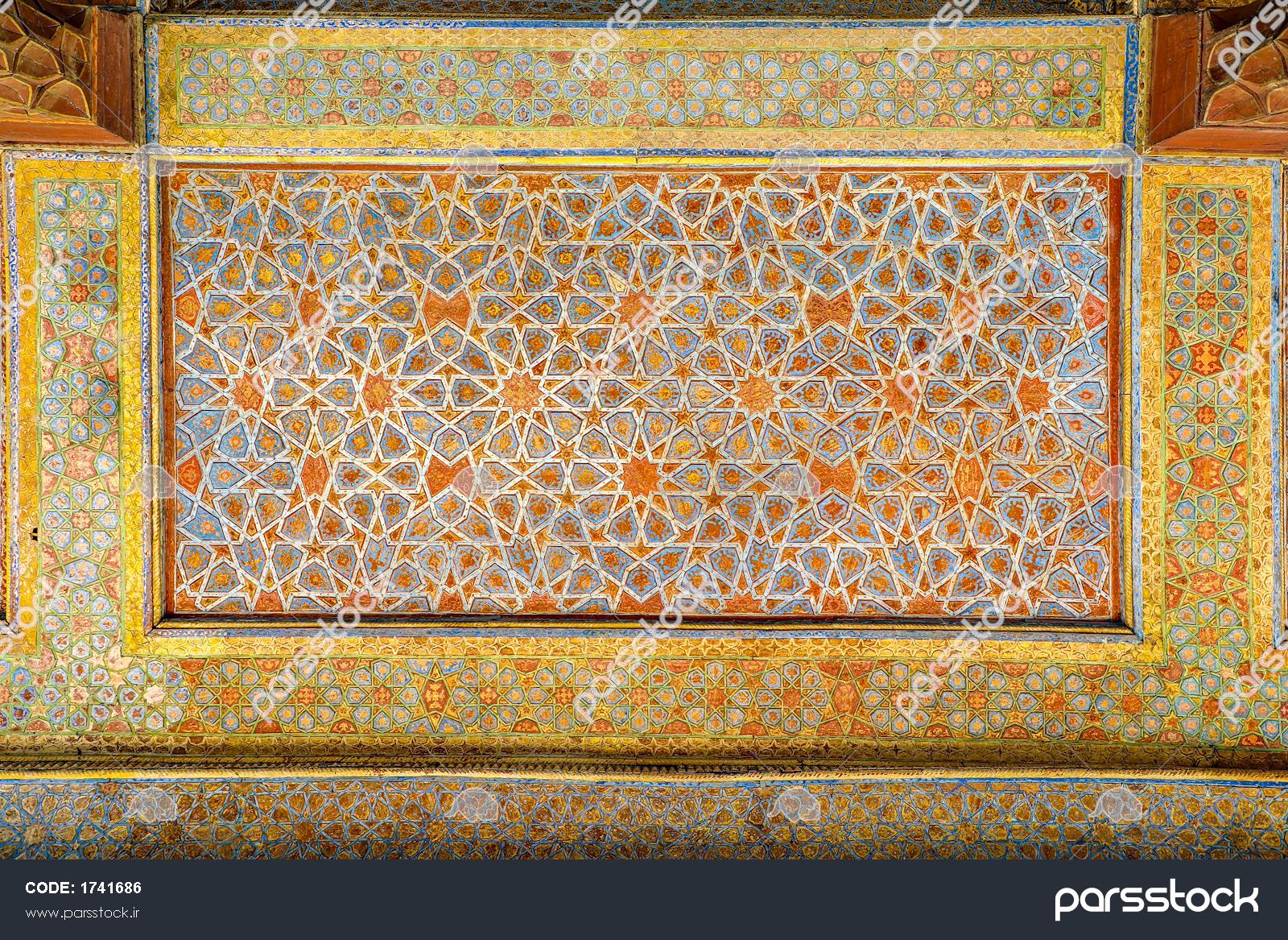 عکاسی کلوزآپ از تزئینات سقف گره‌چینی چهلستون اصفهان برای والپیپر باکیفیت