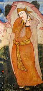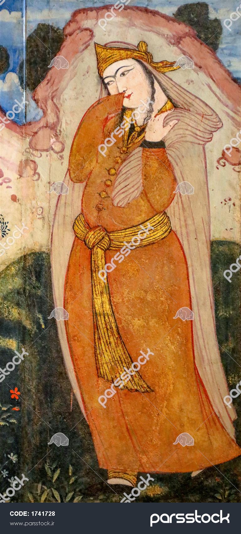 نقاشی باکیفیت زن صفوی با پوشش بلند نارنجی و شال طلایی روی دیوار چهلستون