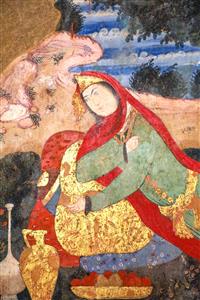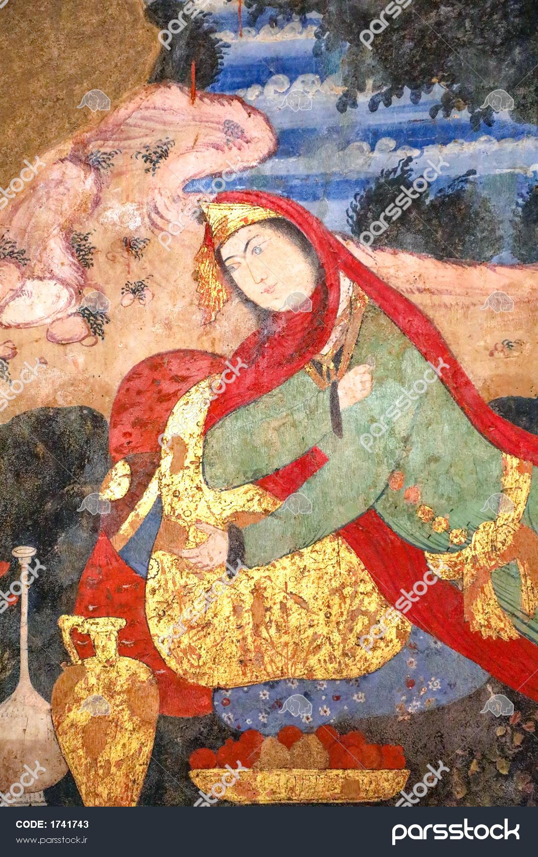 نقاشی زن صفوی (دلبر) در حال دراز کشیدن بر بالین و تکیه بر کوزه در طبیعت چهلستون اصفهان