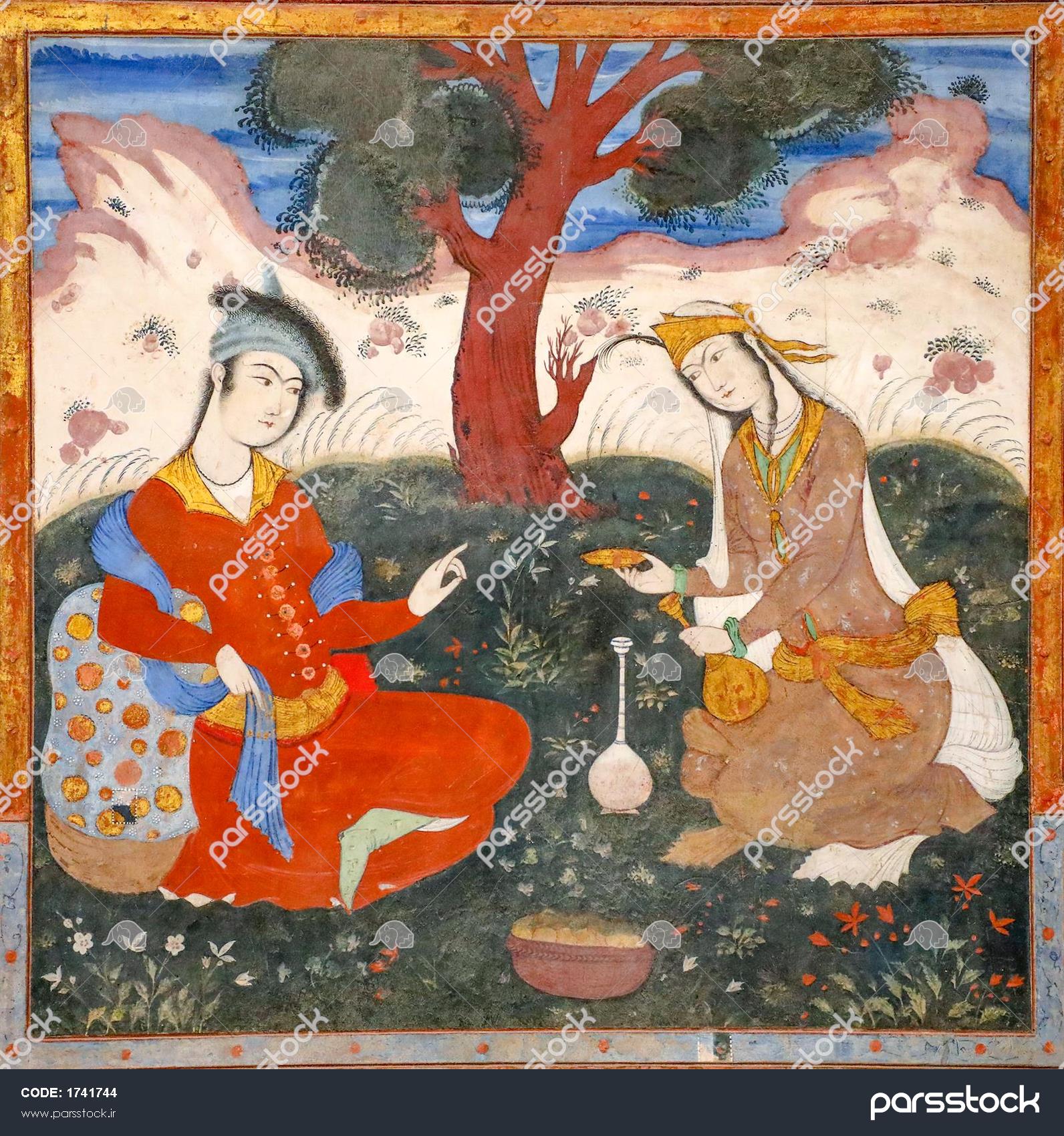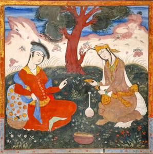 نگارگری دو دلبر صفوی (زن و مرد) در حال بزم و گفت‌وگو در فضای سبز چهلستون اصفهان