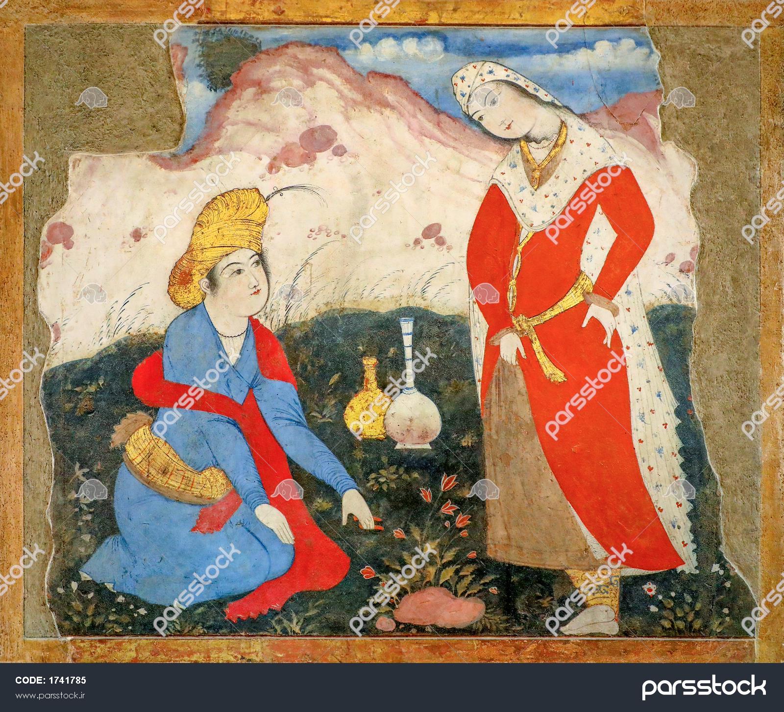 نقاشی بزم عاشقانه زن و مرد صفوی زیر درخت در نگارگری چهلستون نقاشی زن و مرد صفوی (عاشق و معشوق) با جام شراب در باغ (مینیاتور) نقاشی بزم شاهی و فضای باغ، زن و مرد صفوی زیر درخت (مینیاتور) نگارگری مرد صفوی با کلاه خزدار و لباس آبی در حال چیدن گل در باغ مینیاتور مرد صفوی (درویش) در حال استراحت در باغ (نقاشی چهلستون) نقاشی زن و مرد درویشمسلک زیر درخت (صحنه بزم یا دیدار عاشقانه) مینیاتور مرد صفوی (درویش) در حال استراحت در باغ (بخش فرسوده نقاشی) نقاشی بزم دو مرد صفوی با جام و بطری شراب در فضای باغ جزئیات نقاشی عاشقانه زن و مرد صفوی زیر درخت (چهرهنگاری چهلستون) نگارگری زن با لباس قرمز و روسری سفید طرحدار در فضای باغ چهلستون نمایش همه