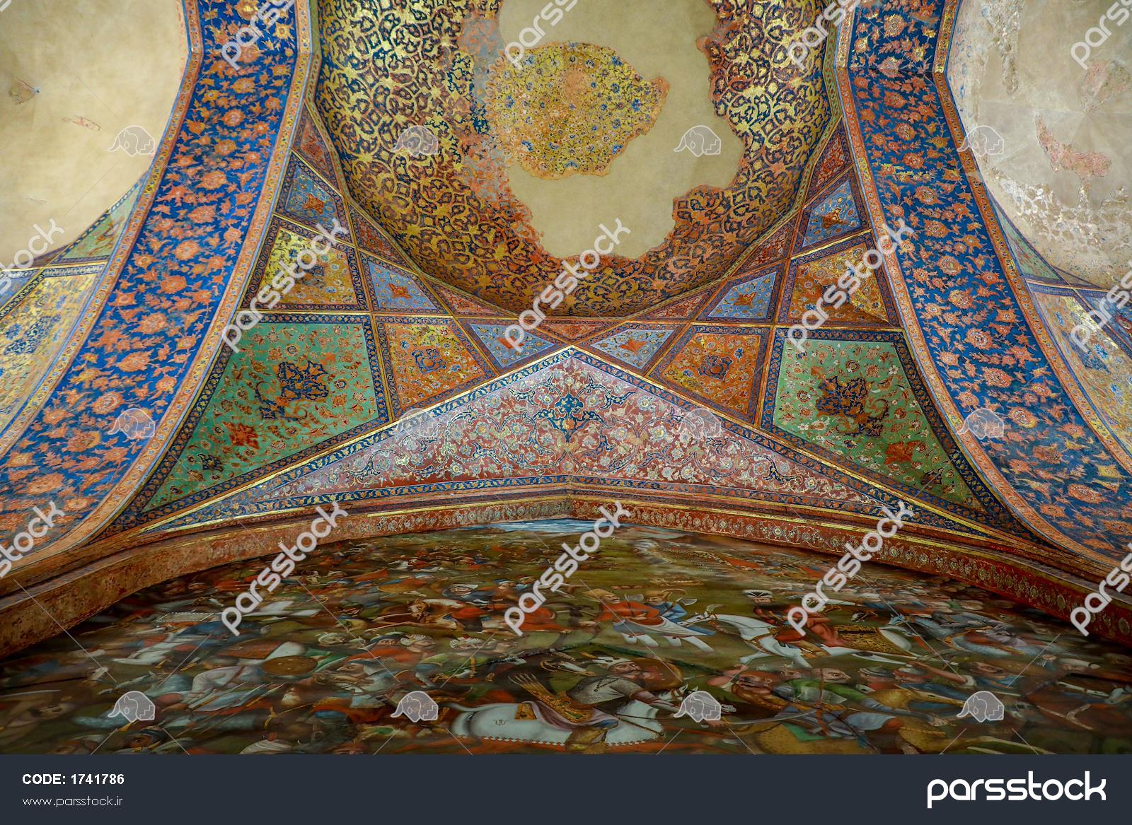 سقف طاق‌دار و نگارگری‌های اسلیمی بالای نقاشی نبرد چهلستون