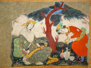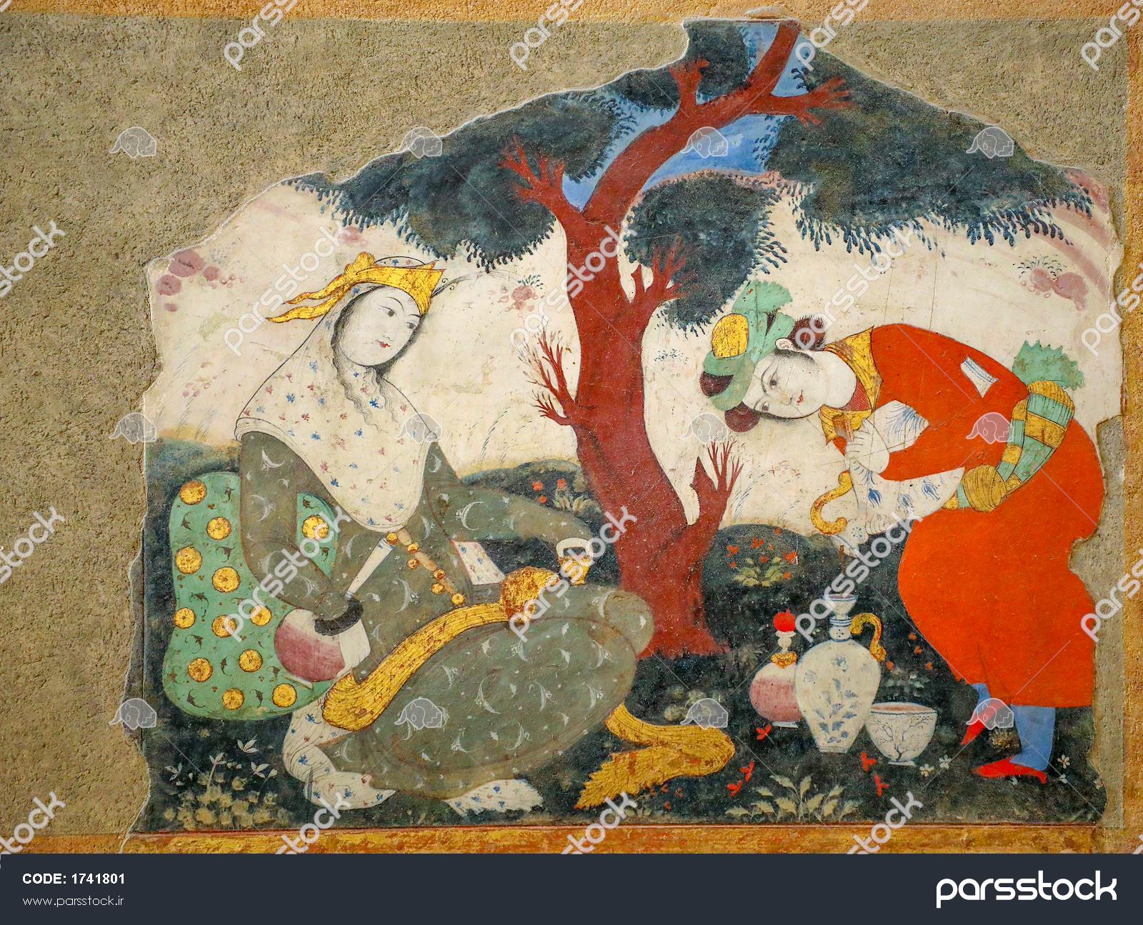 نقاشی بزم شاهی و فضای باغ، زن و مرد صفوی زیر درخت (مینیاتور)