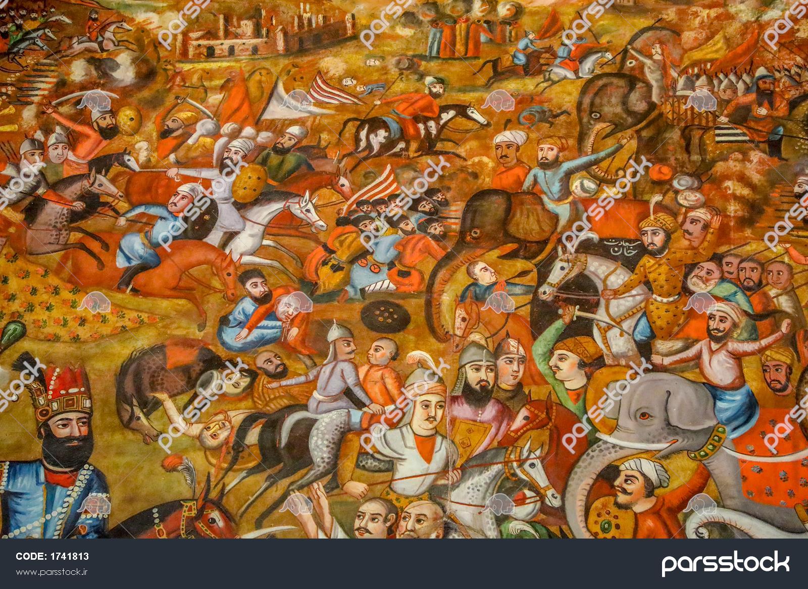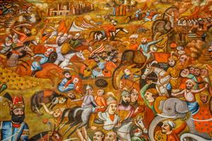 نقاشی باکیفیت نبرد کرنال یا چالدران با جزئیات سربازان و فیلهای جنگی در چهلستون نقاشی بزرگ نبرد کرنال (تهاجم نادرشاه افشار به هندوستان) در چهلستون نقاشی دیواری میدان نبرد و شکارگاه (نبرد شاه اسماعیل صفوی) در چهلستون نقاشی دیواری تالار چهلستون اصفهان: نبرد نادرشاه با محمدشاه گورکانی نقاشی نبرد چالدران یا کرنال زیر سقف طلاکاری شده چهلستون اصفهان جزئیات نزدیک از چهرههای نقاشی بزم عاشقانه زیر درخت چهلستون جزئیات زن با لباس قرمز صفوی در حال صرف نوشیدنی (نگارگری چهلستون) جزئیات نقاشی عاشقانه زن و مرد صفوی زیر درخت (چهرهنگاری چهلستون) جزئیات نقاشی زن صفوی با سرپوش سنتی در حال نوشیدن (مینیاتور) نقاشی دیواری میدان نبرد با تزئینات سقف و آرایههای مقرنسکاری شده نمایش همه