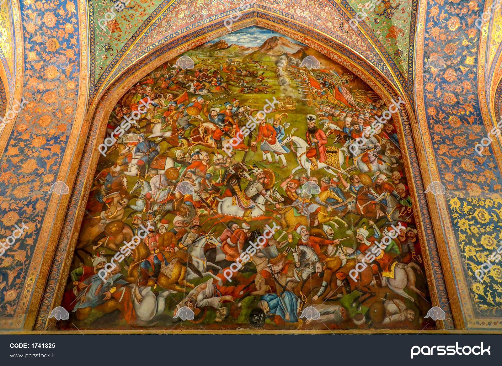 پنجره قدی بزرگ و نرده مشبک ایوان چهلستون مناسب چاپهای دکوراتیو نگارگری خسرو دوم و شاهزاده خانم ارمنی شیرین کاشی بزرگ نقاشی دیواری میدان نبرد با تزئینات سقف و آرایههای مقرنسکاری شده نقاشی دیواری تالار چهلستون اصفهان: نبرد نادرشاه با محمدشاه گورکانی نقاشی نبرد چالدران یا کرنال زیر سقف طلاکاری شده چهلستون اصفهان نقاشی افقی میدان نبرد و سوارهنظام در تالار کاخ چهلستون (پانوراما) نقاشی دیواری کاخ چهلستون اصفهان (جزئیات نبرد شاه اسماعیل با ازبکان) تصویر نزدیک از نقاشی نبرد صفوی عثمانی در تالار اصلی چهلستون جزئیات نزدیک از سربازان و نادرشاه سوار بر اسب در نقاشی چهلستون نقاشی دیواری میدان نبرد و شکارگاه (نبرد شاه اسماعیل صفوی) در چهلستون نمایش همه