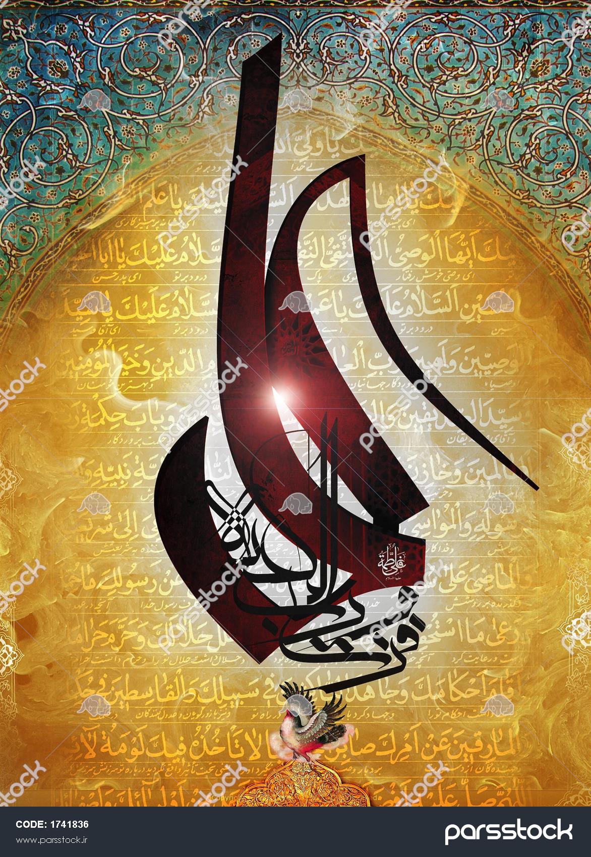 طرح خوشنویسی فزت و رب الکعبه امام علی (ع) با پس‌زمینه کاشی‌کاری و طلایی فاخر