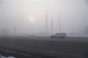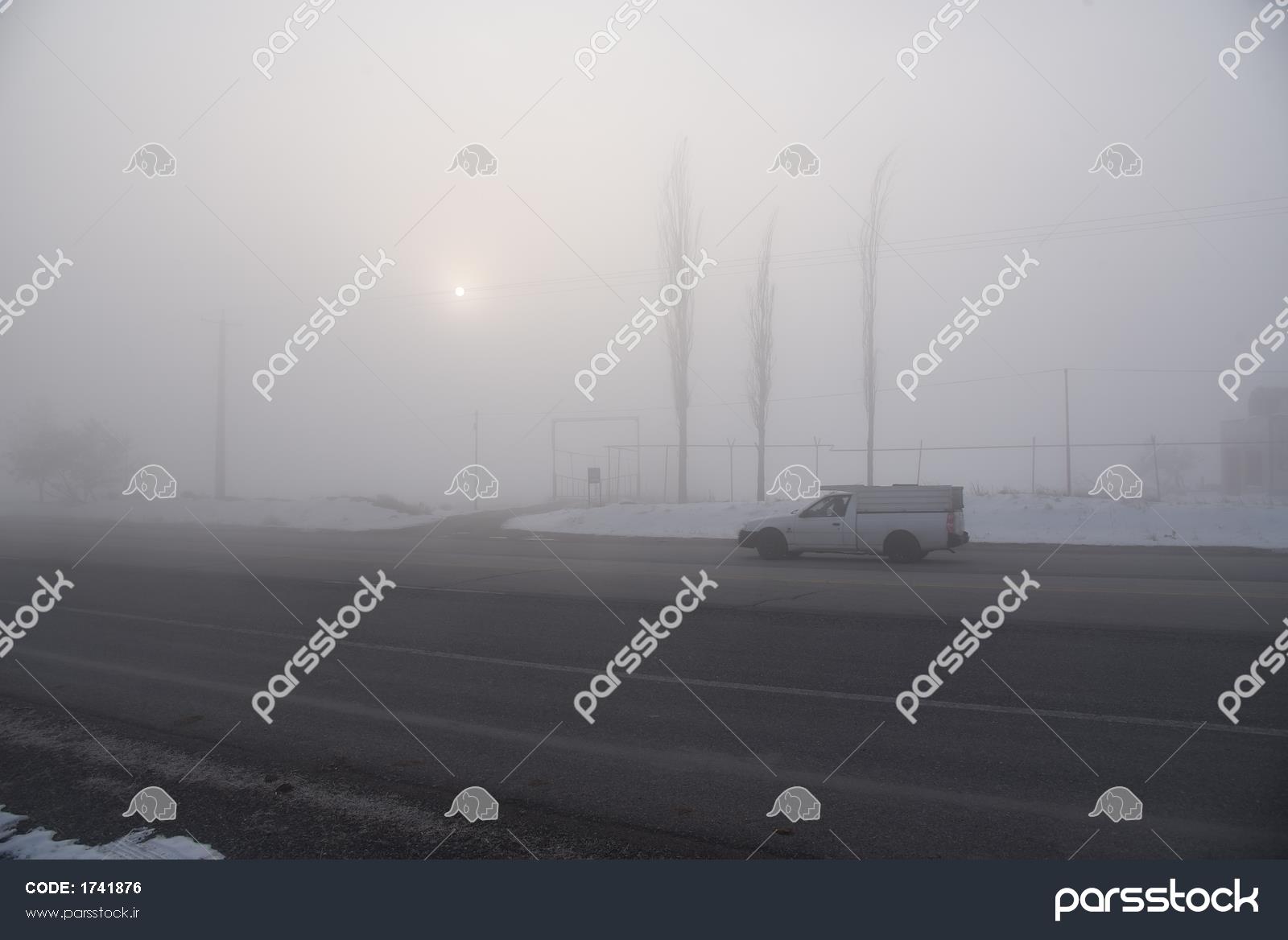 خودرو ون سفید در حال عبور از جاده مه‌آلود کنار خطوط در زمستان